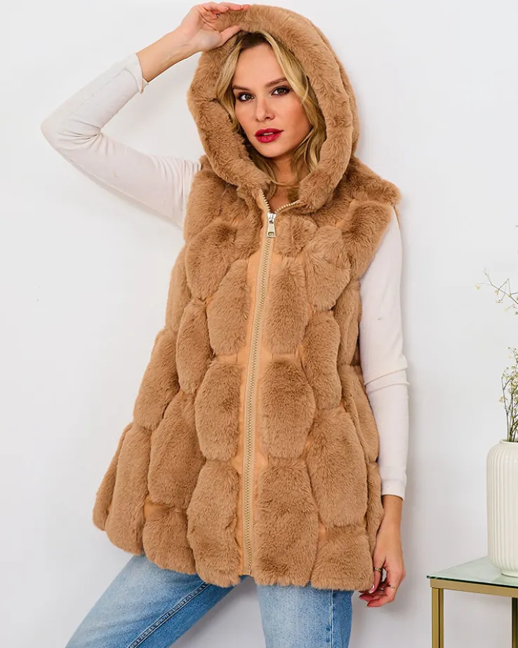 - Rewelacyjna kamizelka damska wykonana z miękkiego w dotyku sztucznego futerka. Bezrękawnik zapinany na zamek błyskawiczny, posiada kaptur i 2 wsuwane kieszenie. Produkt z podszewką. Świetne dopełnienie jesiennych stylizacji!!