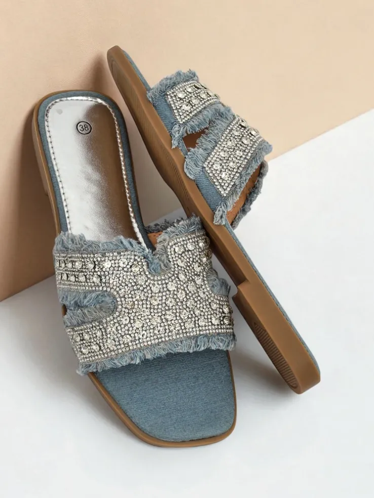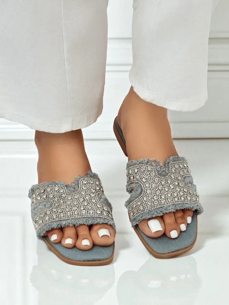 - Płaskie klapki damskie z eko skóry, ozdobione lśniącymi cyrkoniami. Stylowe i wygodne, idealne na lato i specjalne okazje. Dodają blasku każdej stylizacji, zapewniając komfort noszenia przez cały dzień.