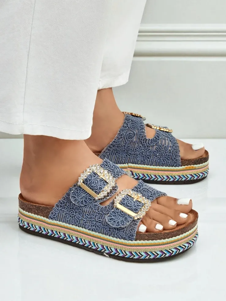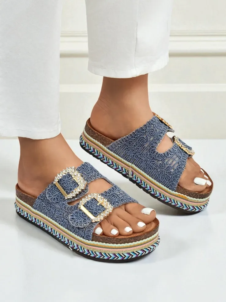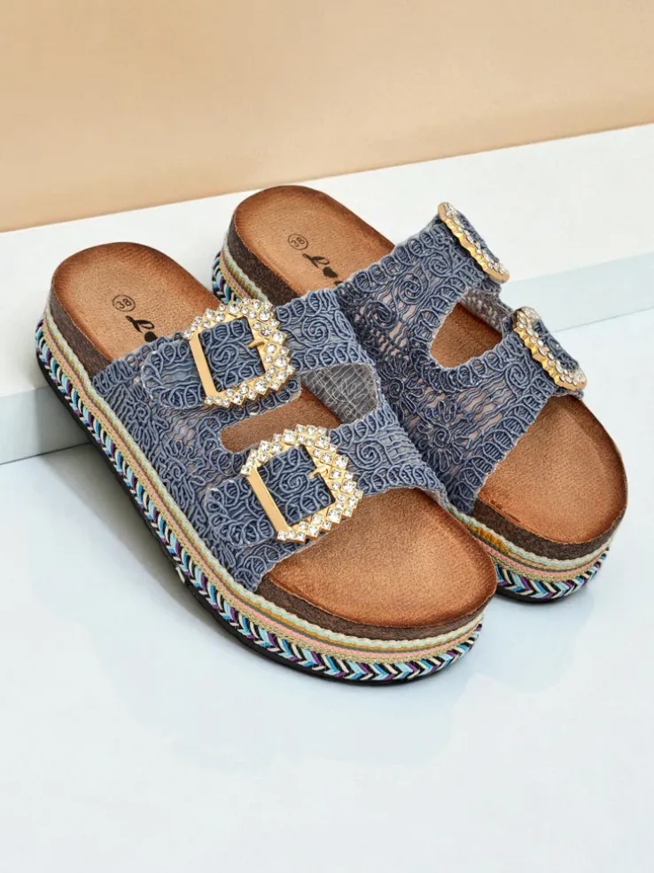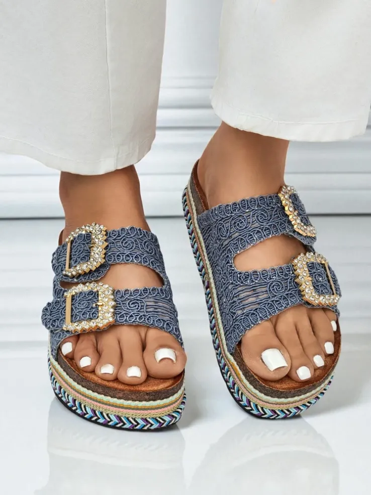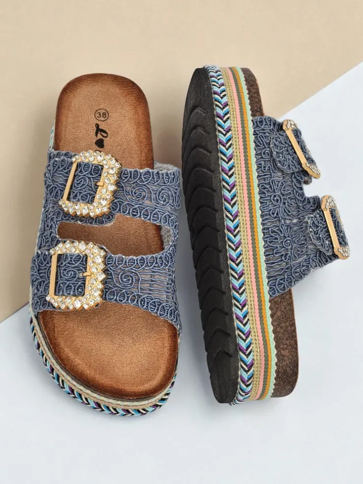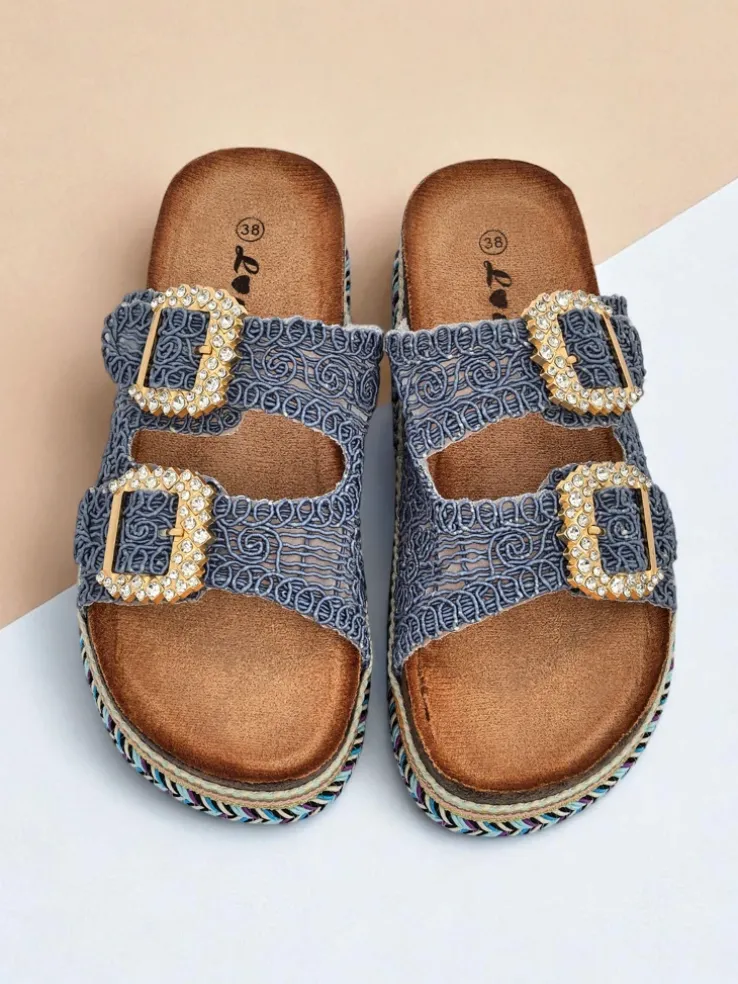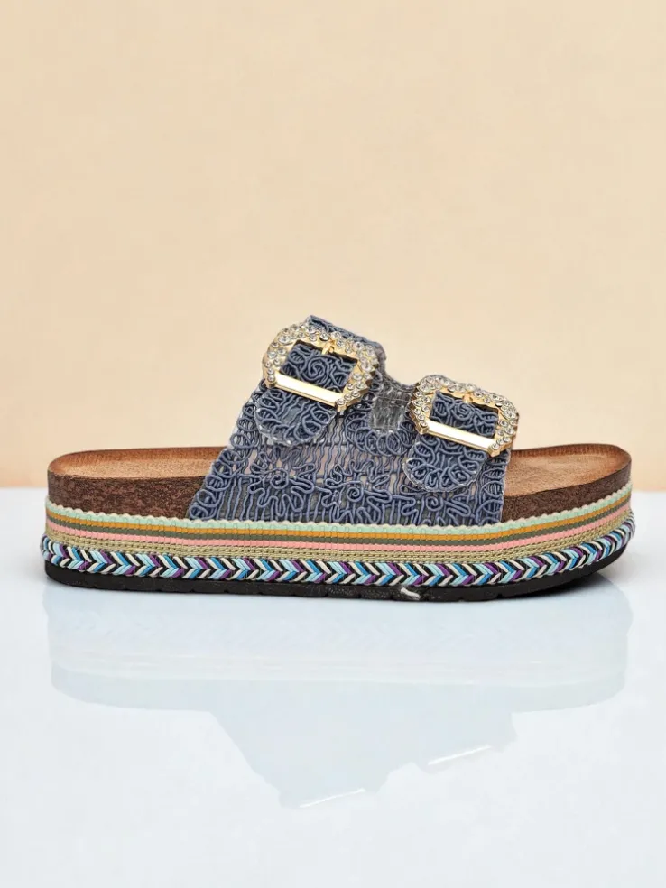 - Stylowe klapki na platformie à la korek, z plecionymi tkaninowymi paseczkami zdobionymi klamerkami z cyrkoniami. Wygodna eko zamszowa wkładka zapewnia komfort, a błyszczące detale dodają elegancji letnim stylizacjom.
