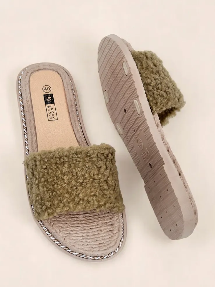 - Płaskie klapki damskie z lekką, gumową podeszwą i miękkim paseczkiem pokrytym materiałem a’la kożuszek. Idealne na chłodniejsze, letnie dni – wygodne, ciepłe i stylowe.