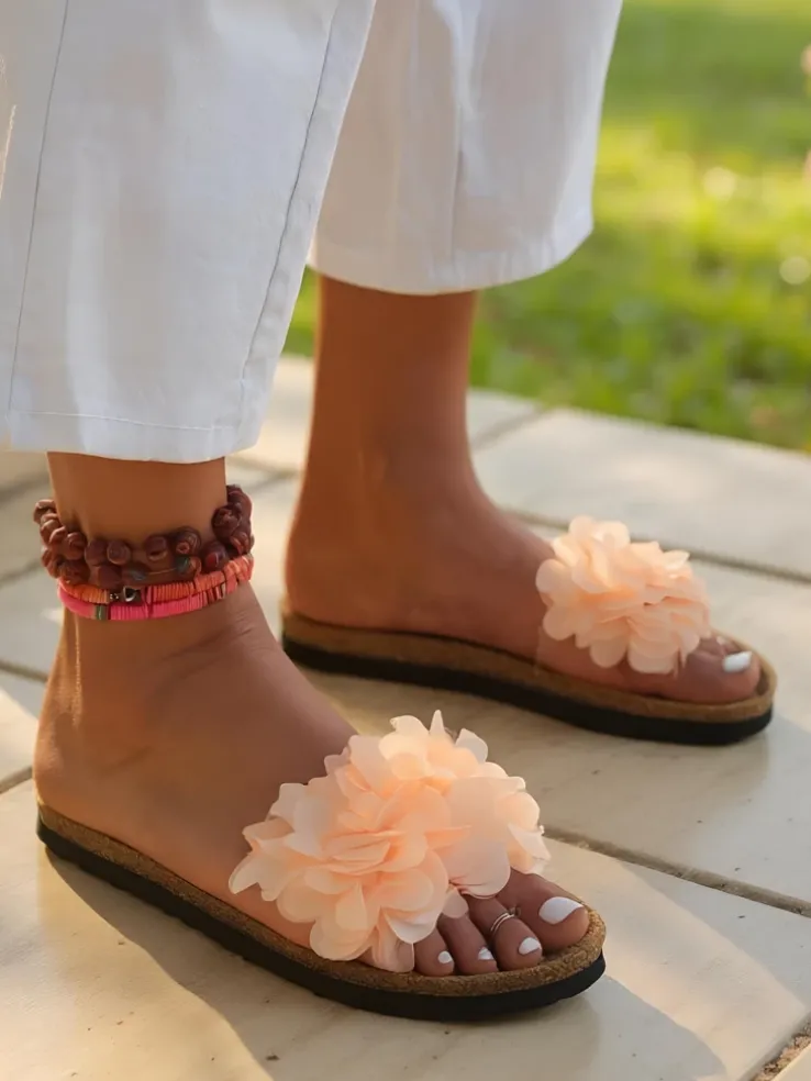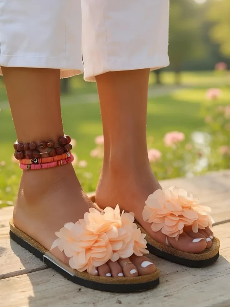 - Urocze klapki z płaską, gumową podeszwą i ozdobnymi kwiatuszkami na paseczku. Idealne na lato – lekkie, wygodne i kobiece. Dodadzą uroku każdej stylizacji.