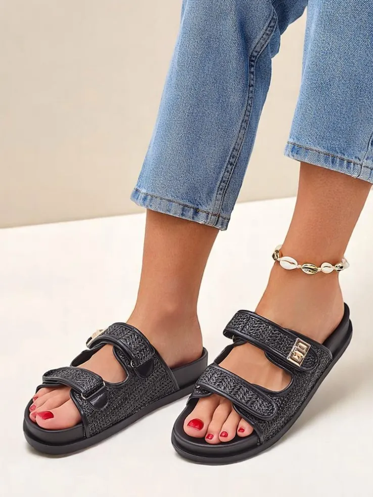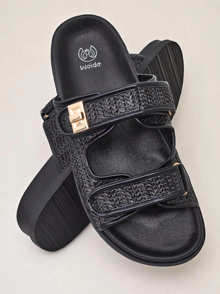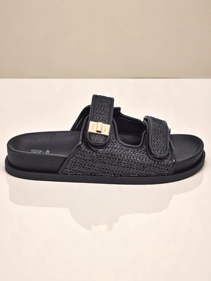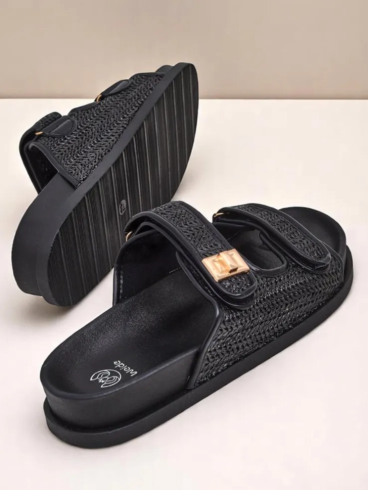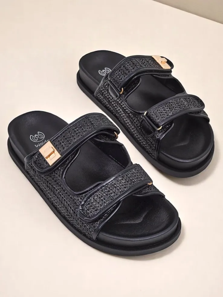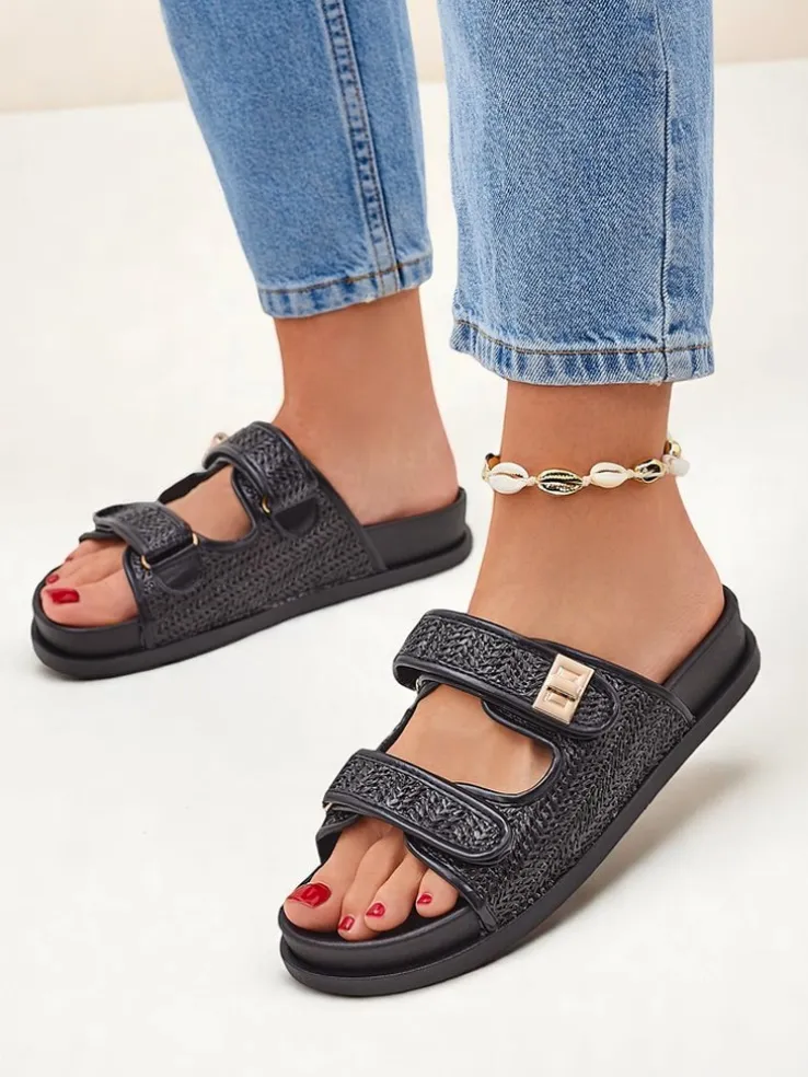 - Przepiękne klapki damskie wykonane z tkaniny słomianej zdobione plastikowymi klamerkami. Gumowa podeszwa. Model posiada regulację na rzepy. Idealnie uzupełnią letnie stylizacje!