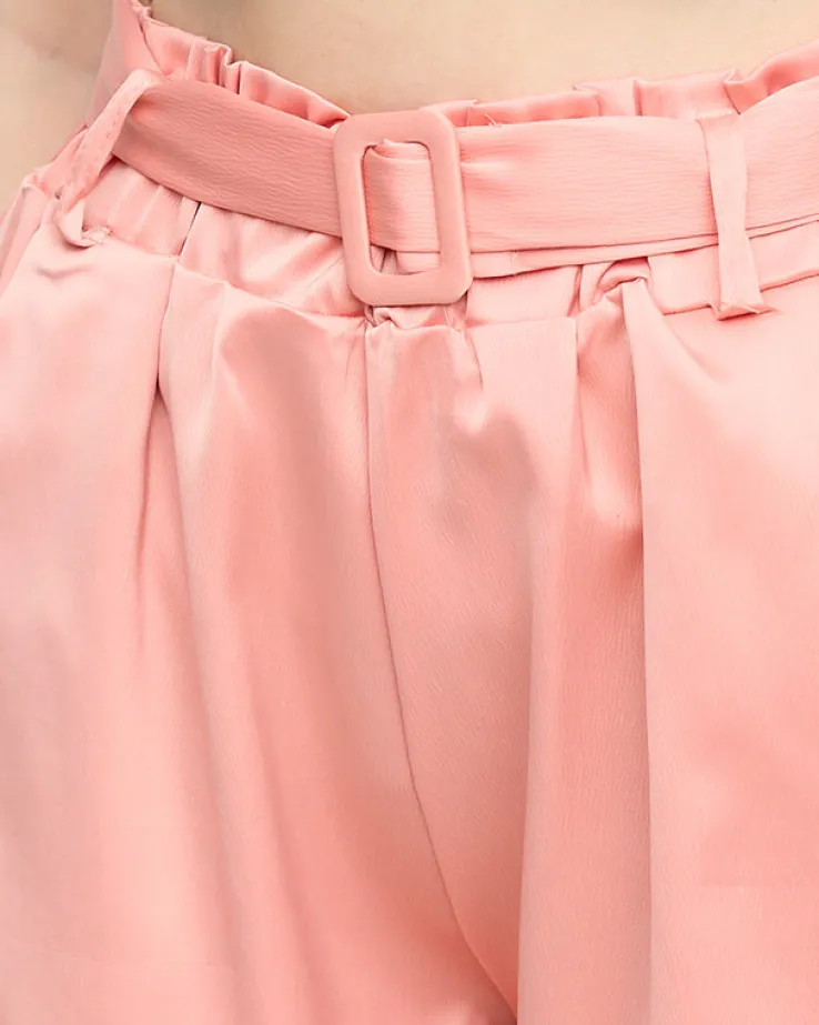 - Eleganckie damskie krótkie spodenki wykonane z satynowej tkaniny bawełnianej. Model typu szorty, posiada dwie wsuwane kieszenie, talię paper bag i pasek. Świetnie sprawdzą się z koszulą i sandałkami! UWAGA: Dokładność pomiaru (+/-) 1 cm.