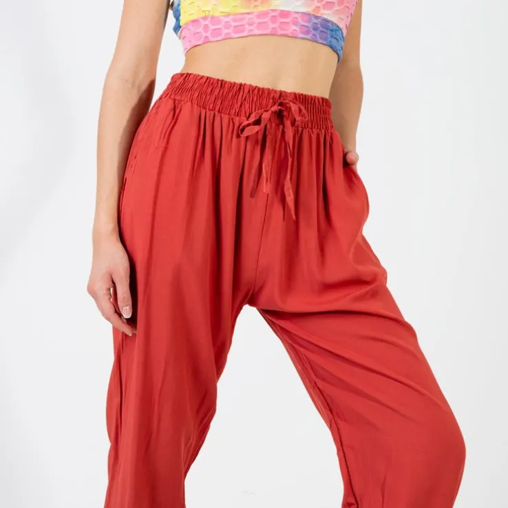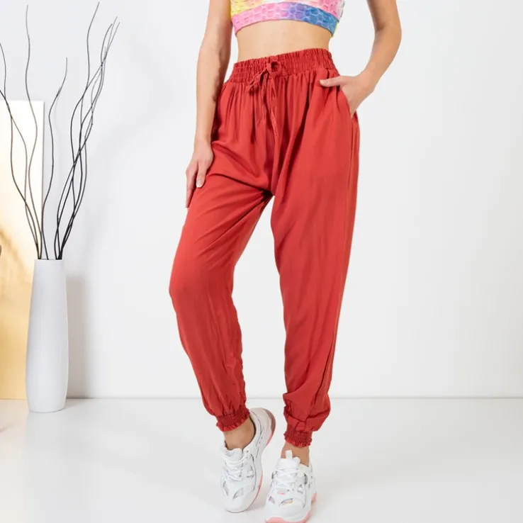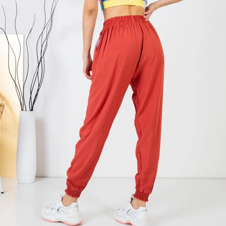 - Lekkie damskie materiałowe spodnie typu haremki, wykonane z tkaniny bawełnianej. Model posiada gumkę w pasie i nogawkach, z przodu – dwie wsuwane kieszenie. Zapewniają pełen komfort i swobodę ruchów. UWAGA: Dokładność pomiaru (+/-) 1 cm.