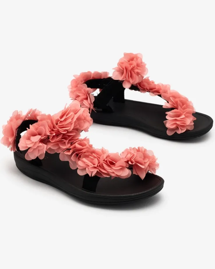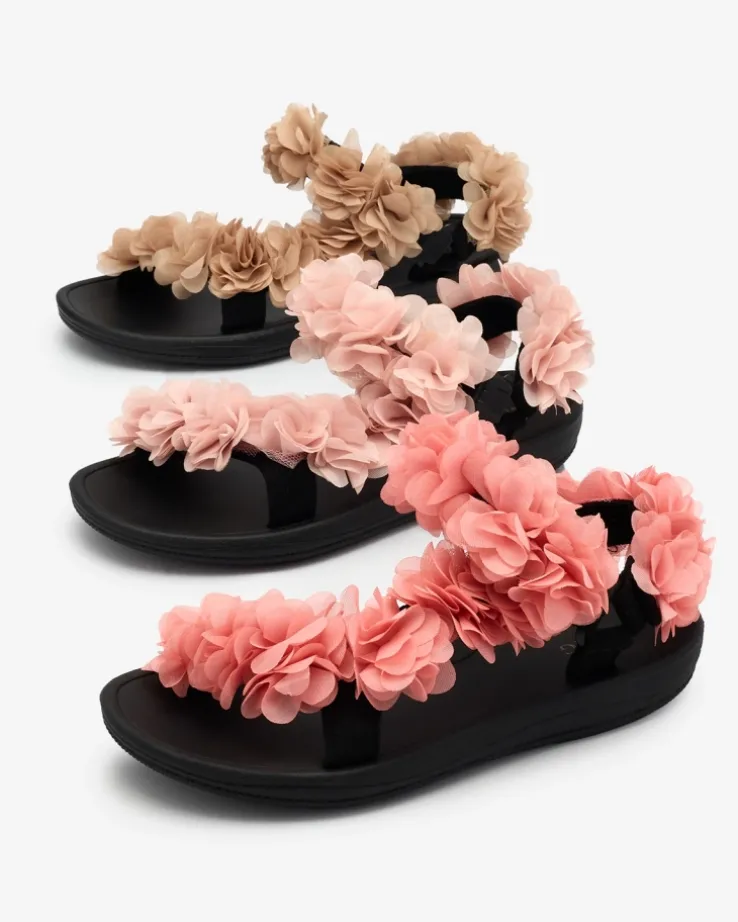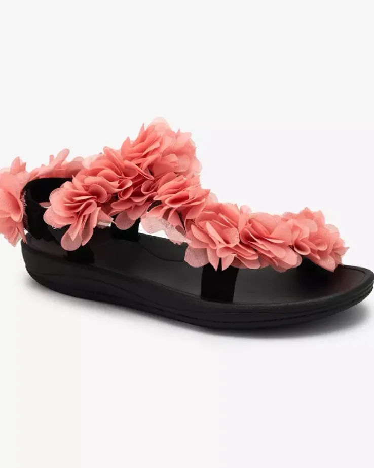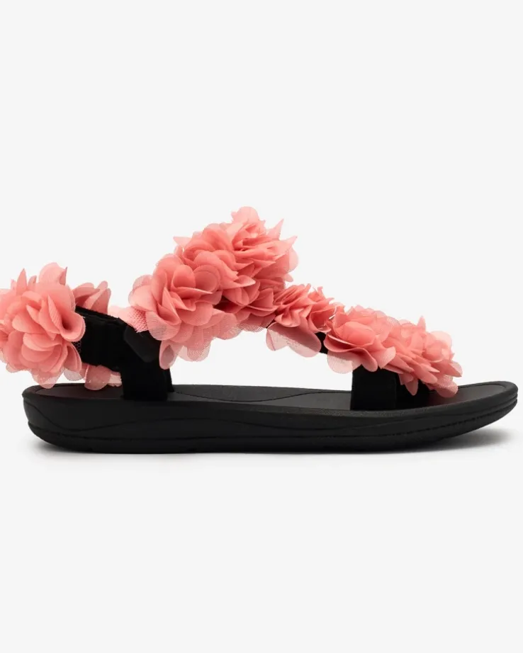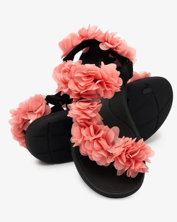 - Prześliczne sandały damskie na płaskiej, gumowej podeszwie. Paseczki wykonane z eko skóry zamszowej i zdobione tkaninowymi kwiatuszkami, obuwie zapinane na rzep. Must have w Twojej walizce wakacyjnej!
