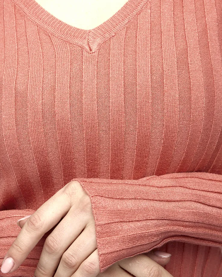 - Klasyczny damski sweter wykonany z miękkiej i elastycznej tkaniny prążkowanej. Produkt posiada długie rękawy i dekolt w serek. Super dodatek do Twoich casualowych outfitów! UWAGA: Dokładność pomiaru (+/-) 1 cm.