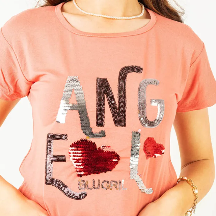 - Damska bluzka z krótkimi rękawami i okrągłym dekoltem. Z przodu ozdobiona napisem z mieniącymi się cekinami. Idealny wybór na wiosnę i lato! UWAGA: Dokładność pomiaru (+/-) 1 cm.