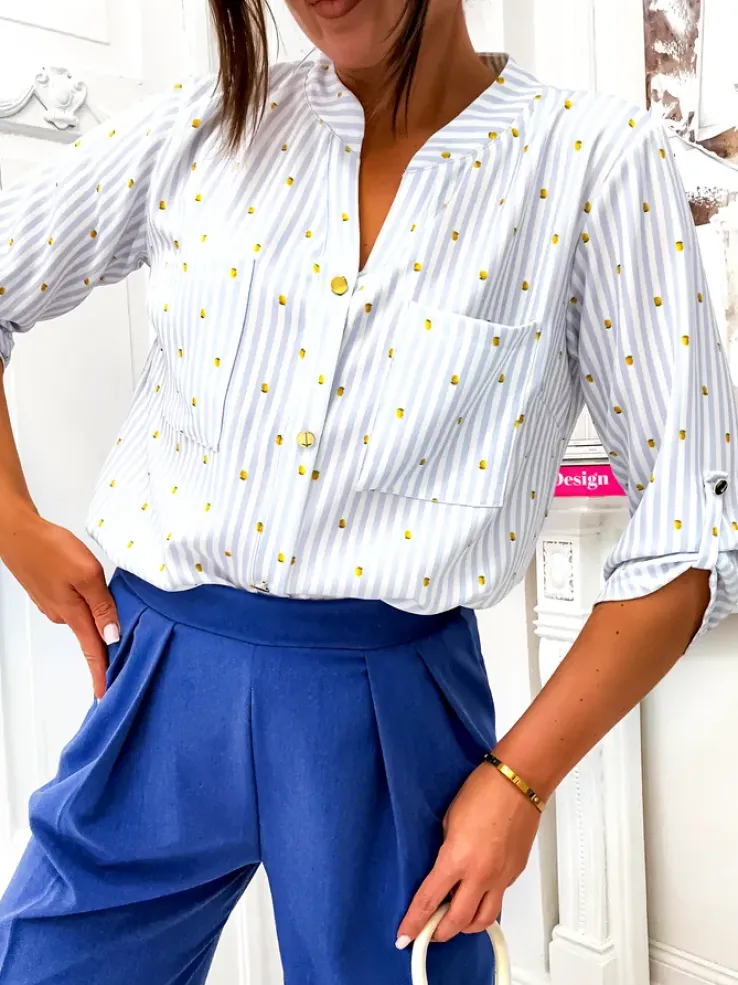 - Rewelacyjna damska koszula w paski i cytrynki z długimi rękawami. Model z dekoltem w serek, jest zapinany na guziki. Must have w szafie każdej kobiety!