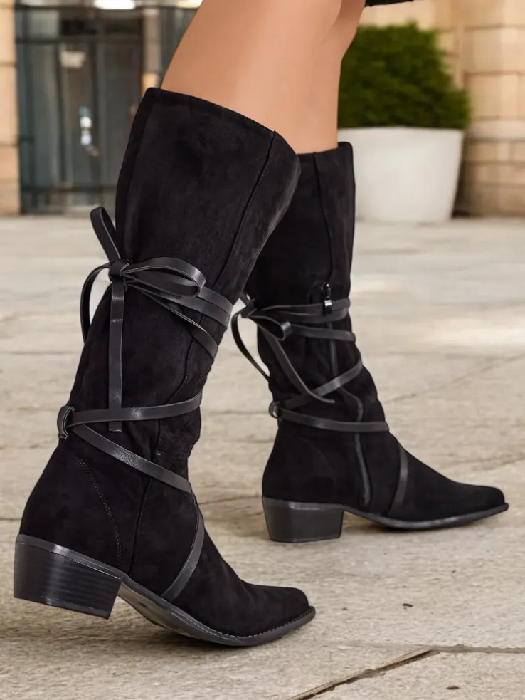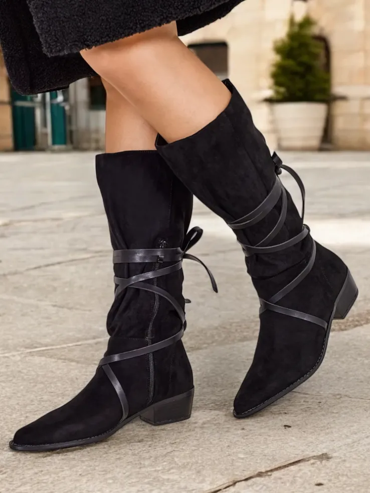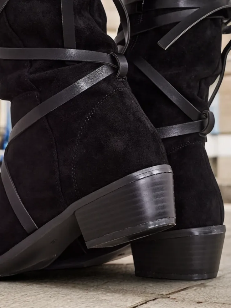 - Gustowne kozaki na niskim obcasie z noskiem w szpic. Model posiada cholewkę wykonaną z eko-zamszu oraz wkładkę z eko-skóry. Obuwie zapinane na suwak. Idealne do jesiennych kreacji!