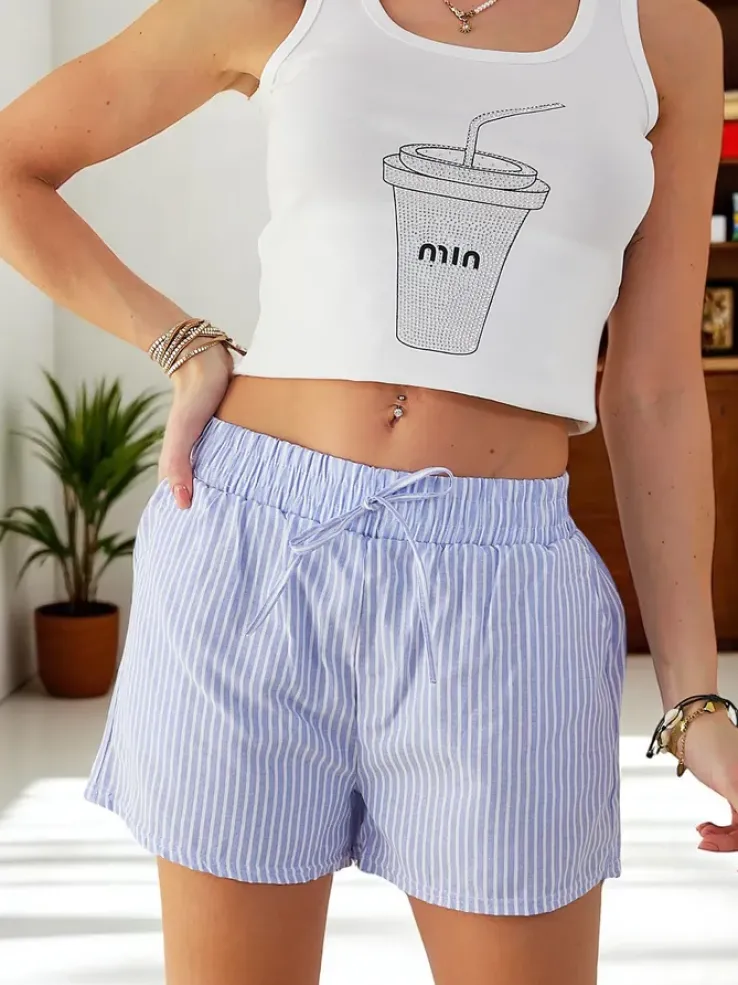 - Lekkie damskie krótkie spodenki materiałowe. Model ze średnim stanem, posiada 2 kieszenie, gumę i wiązanie w pasie. Idealny wybór na lato!