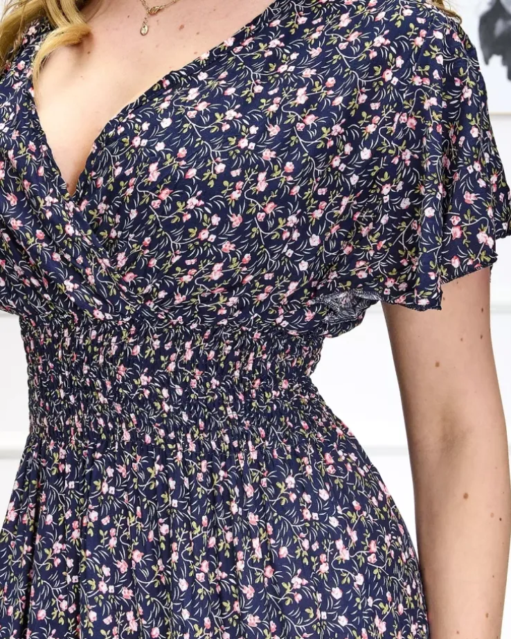 - Kwiecista damska sukienka wykonana z lekkiej i zwiewnej tkaniny. Model z kopertowym dekoltem, posiada krótkie rękawy i gumkę w pasie podkreślają talię. Świetna na lato! UWAGA: Dokładność pomiaru (+/-) 1 cm.