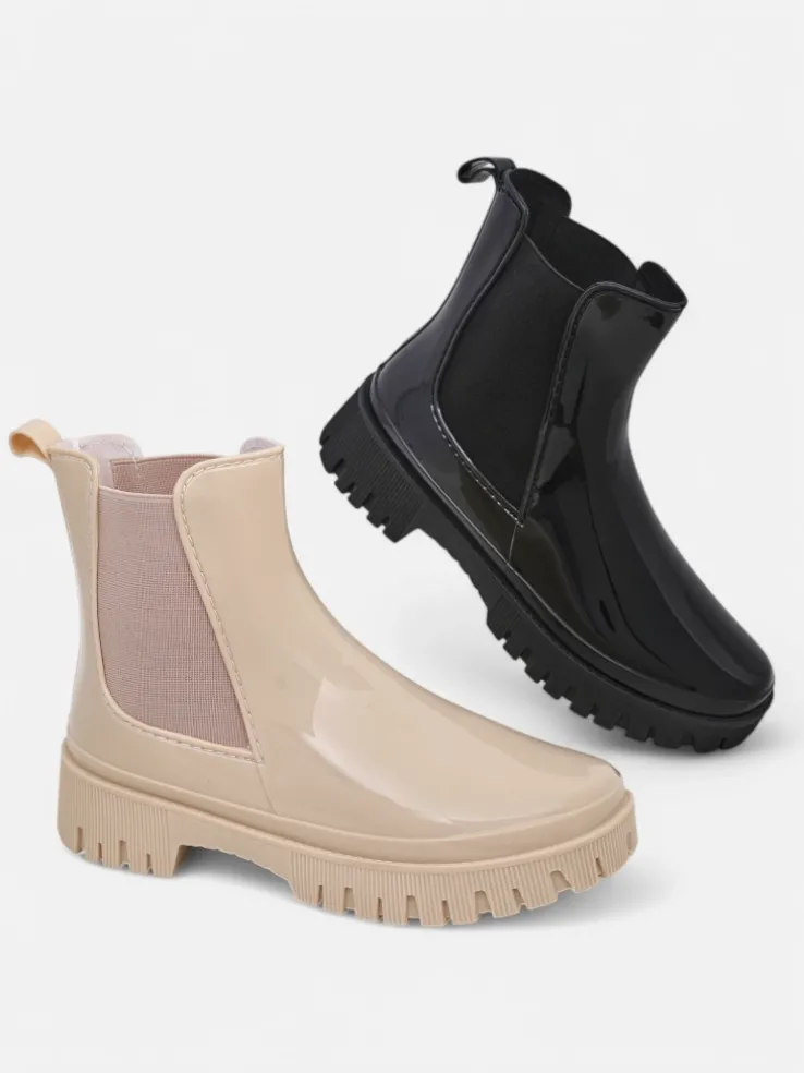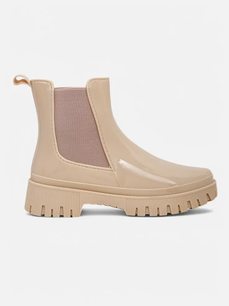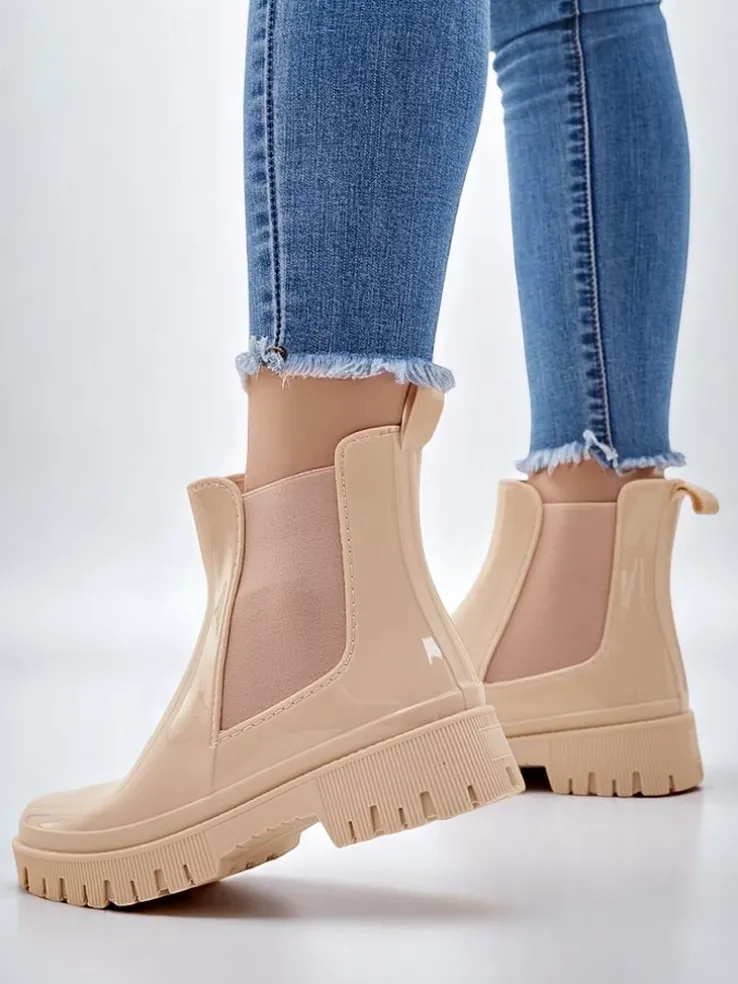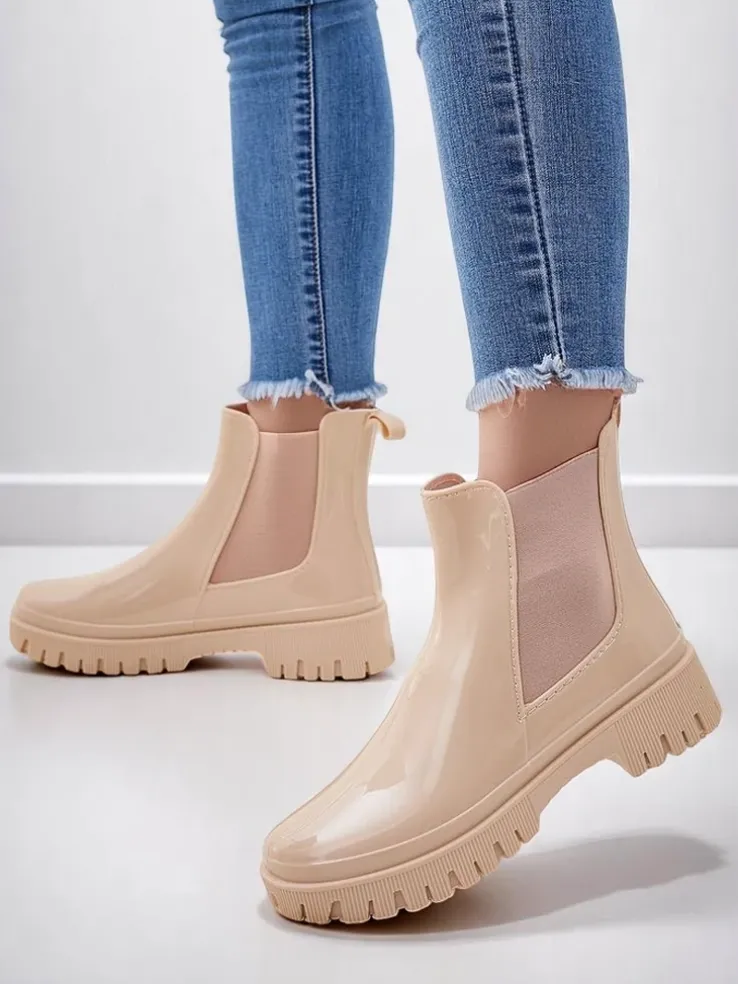 - Klasyczne damskie kalosze wykonane z tworzywa gumowego z lakierowanym wykończeniem. Wkładka to materiał tkaninowy. Obuwie idealne na jesienne deszczowe dni!