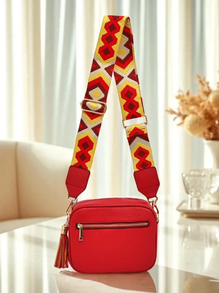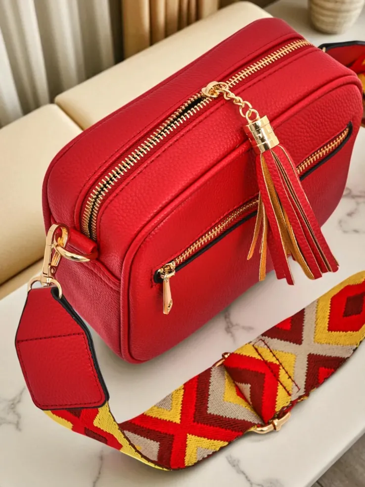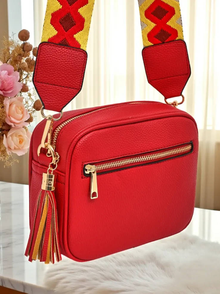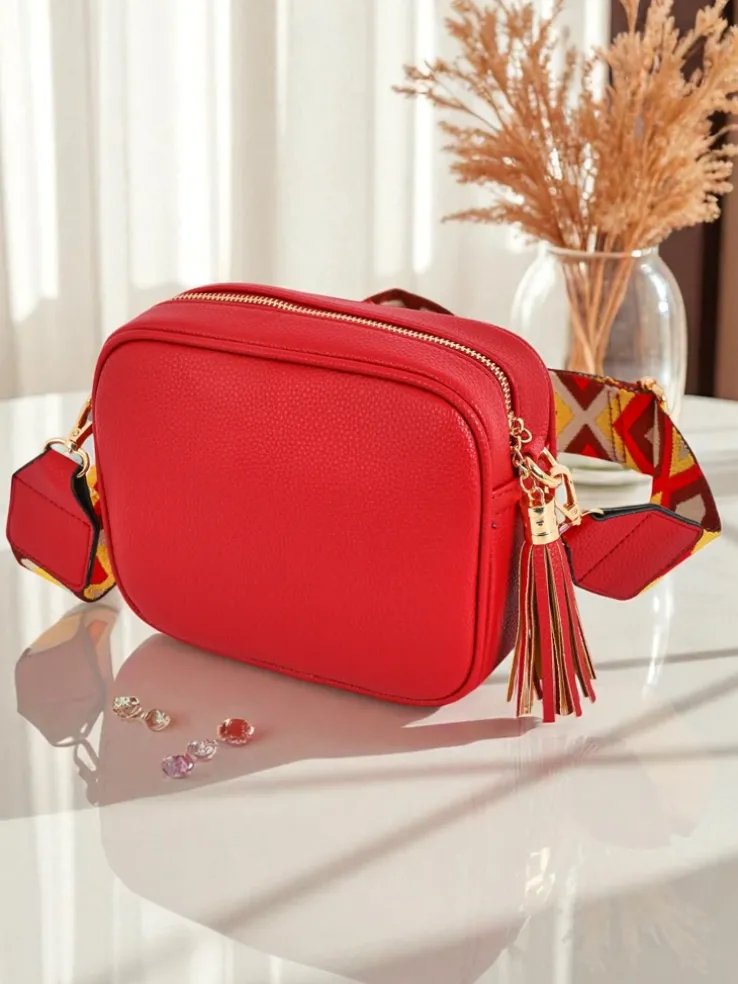 - Stylowa mała torebka z eko skóry z kolorowym paskiem i uroczym frędzelkiem. 1 komora, 2 kieszonki, regulowany i odpinany pasek. Idealna na co dzień i na wyjścia – kompaktowa, a pomieści wszystko, co ważne.