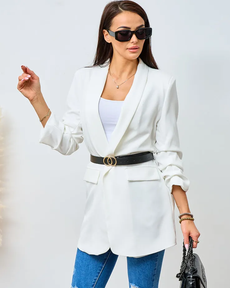 - Stylowa marynarka damska. Model z długimi rękawami, dodatkowo w zestawie posiada pasek. Komfortowa i elegancka! UWAGA: Dokładność pomiaru (+/-) 1 cm.