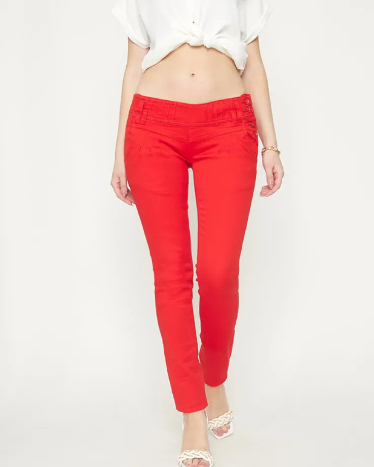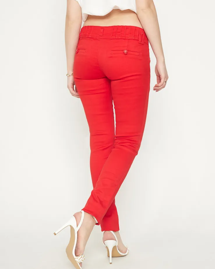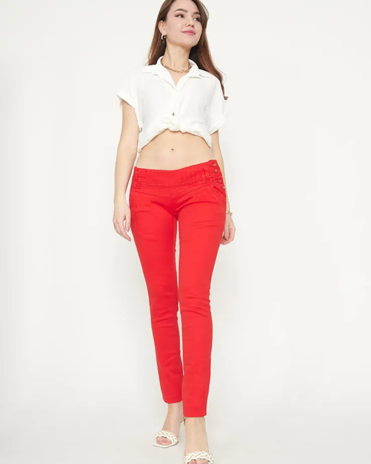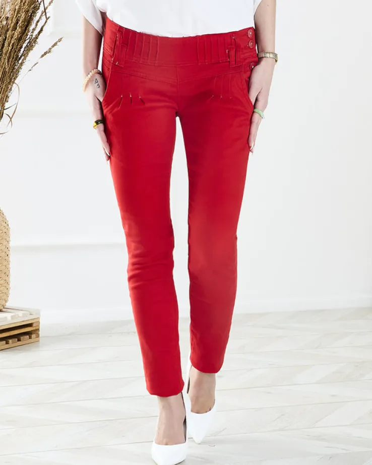 - Stylowe damskie spodnie typu rurki z niskim stanem, wykonane z tkaniny bawełnianej. Model zapinany z boku guzikami, a z przodu posiada wsuwane kieszonki. Must have w szafie każdej kobiety! Dokładność pomiaru (+/-) 1 cm.