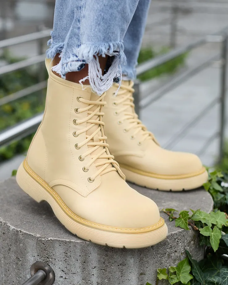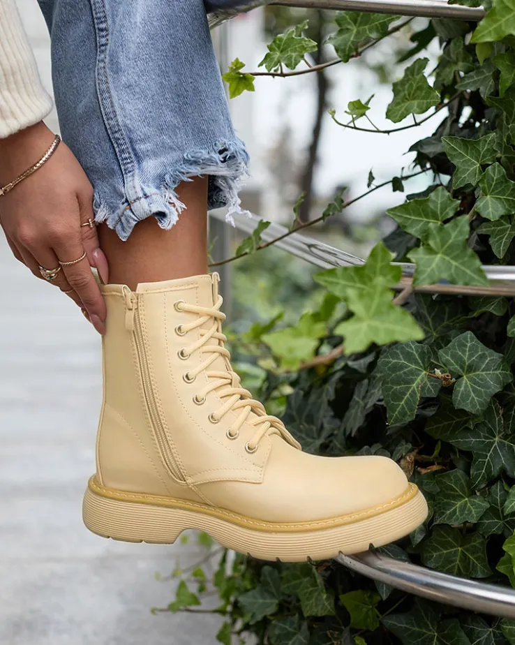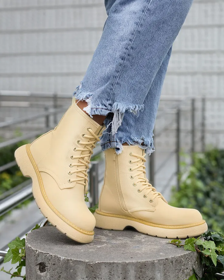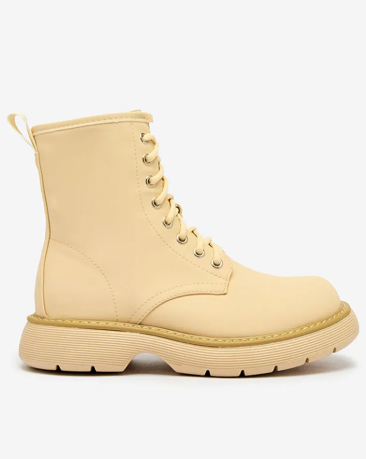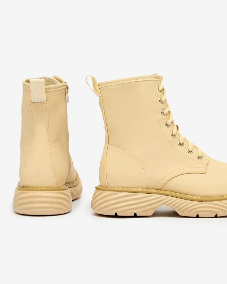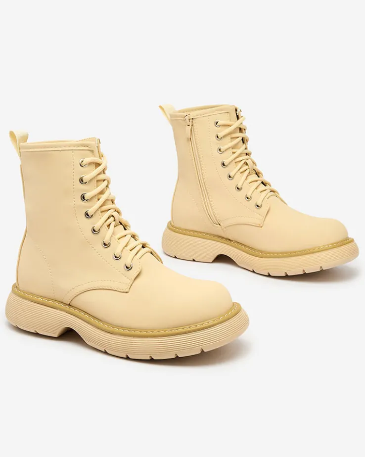 - Wyjątkowe damskie botki wykonane ze skóry ekologicznej matowej oraz eko skórzanej wkładki. Model sznurowany i zapinany na suwak. Wygodny płaski obcas i grubsza podeszwa to idealne połączenie na co dzień!