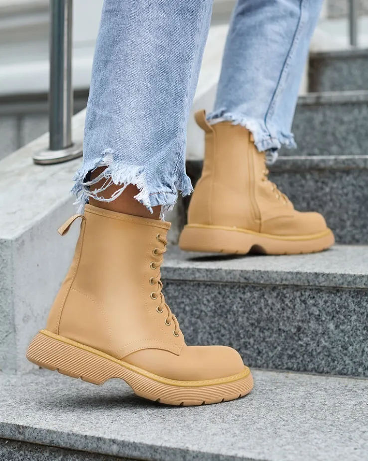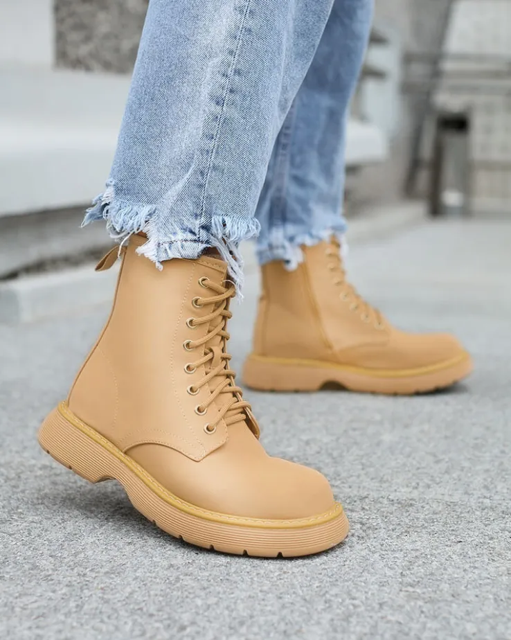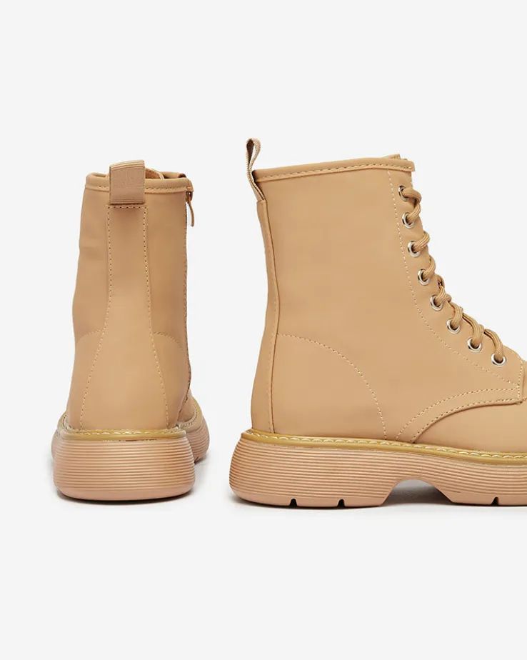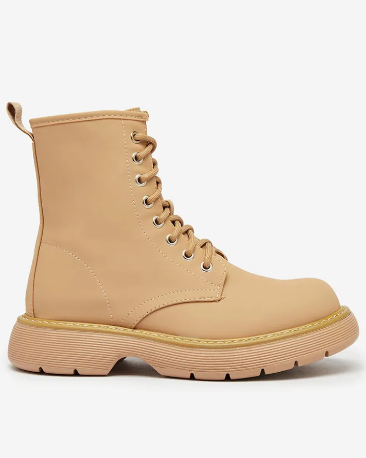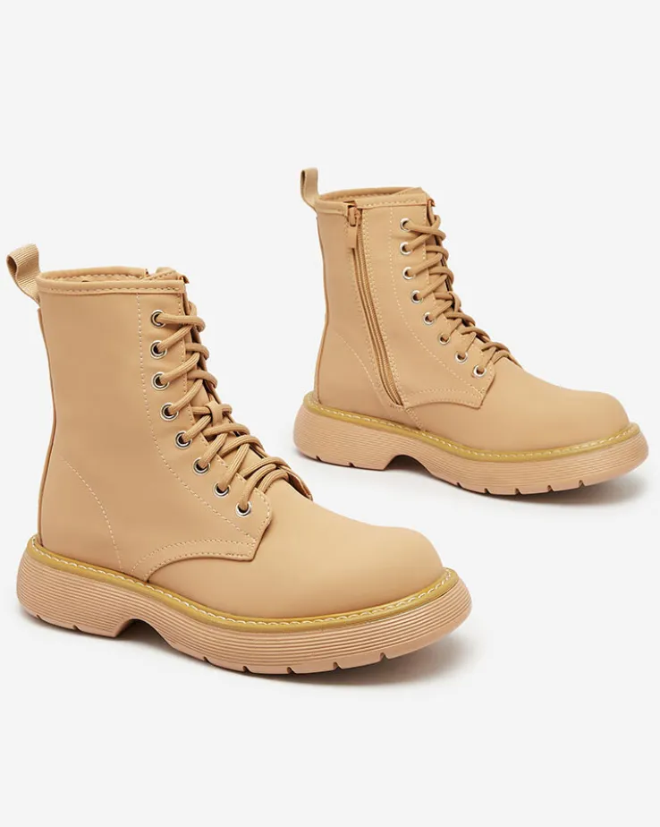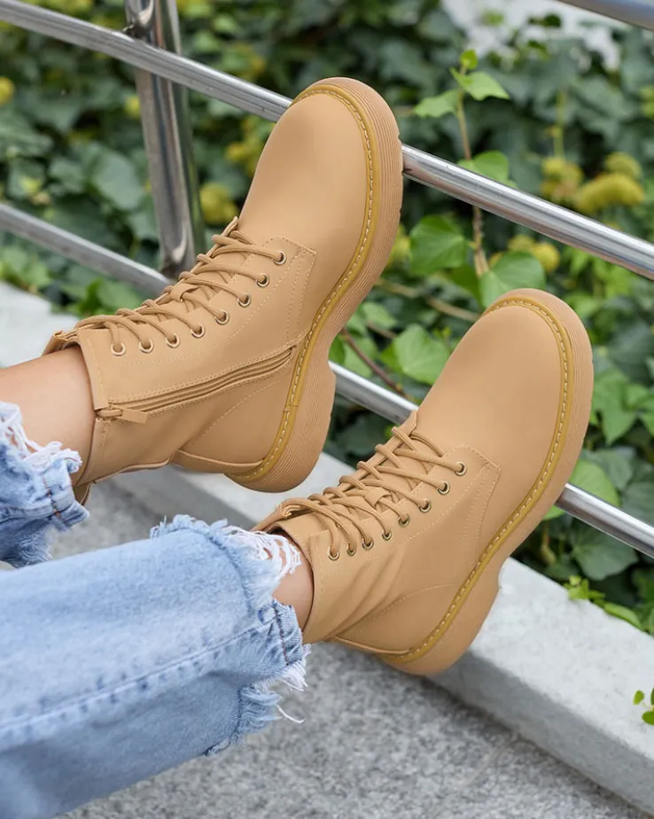 - Wyjątkowe damskie botki wykonane ze skóry ekologicznej matowej oraz eko skórzanej wkładki. Model sznurowany i zapinany na suwak. Wygodny płaski obcas i grubsza podeszwa to idealne połączenie na co dzień!
