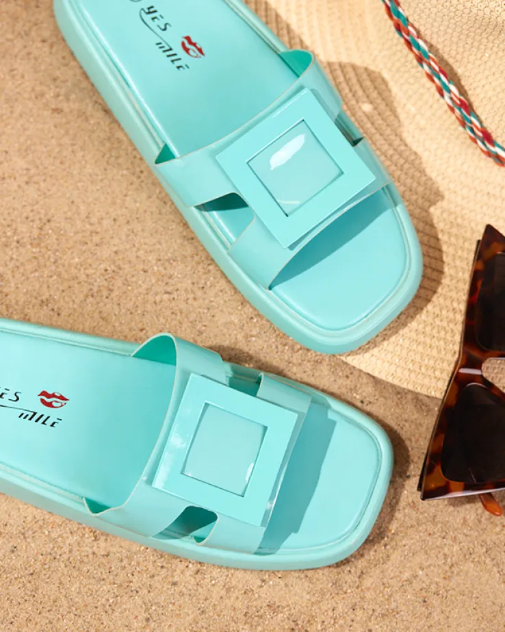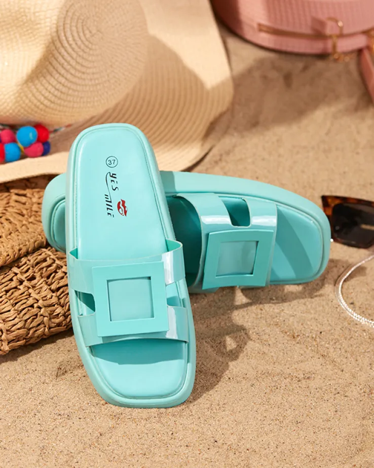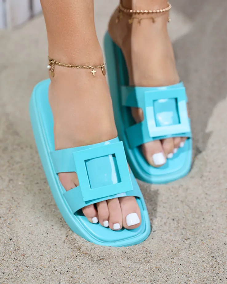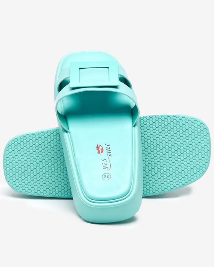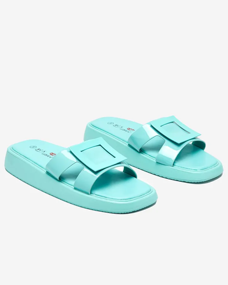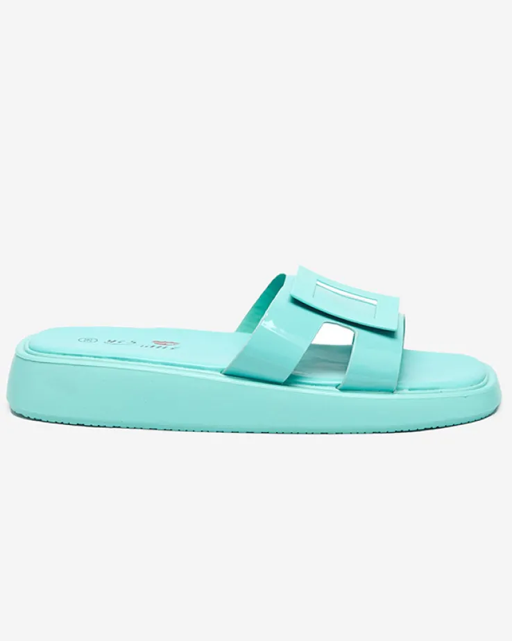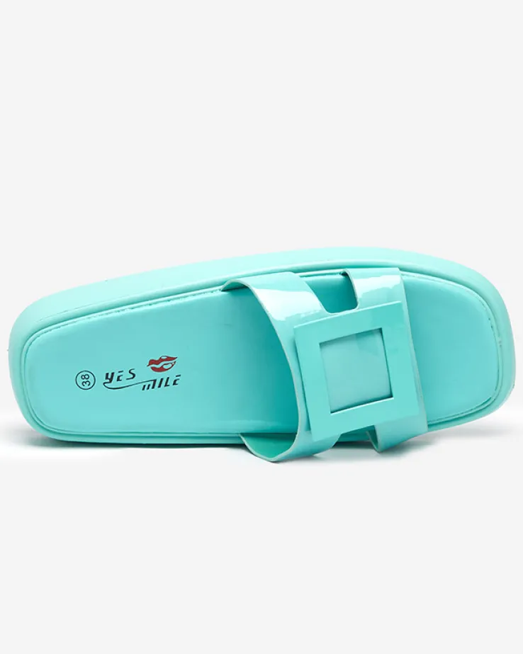 - Stylowe damskie klapki wykonane z połączenia eko-skóry lakierowanej oraz matowej. Cholewka posiada metalową ozdobę w dopasowanym kolorze. Super buty na lato!