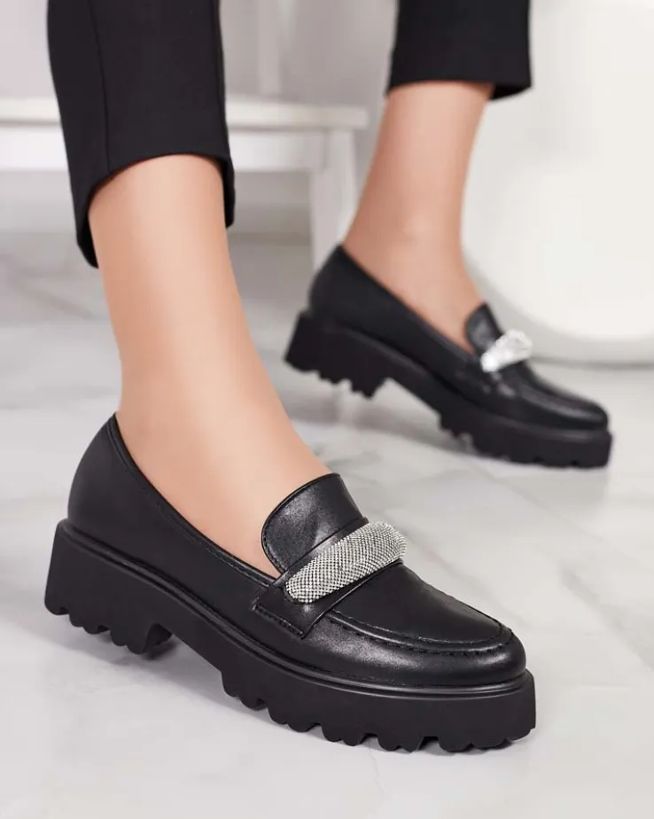 - Klasyczne damskie mokasyny na płaskiej podeszwie. Model jest wykonany ze skóry ekologicznej zamszowej i eko skórzanej wkładki. Posiada cyrkonie i okrągły nosek. Idealna baza na co dzień!
