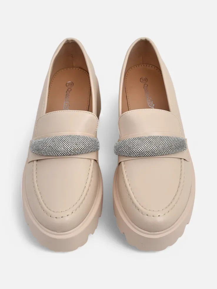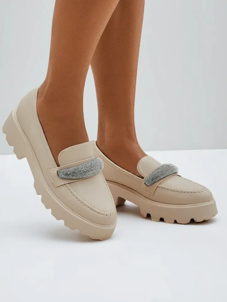 - Klasyczne damskie mokasyny na płaskiej podeszwie. Model jest wykonany ze skóry ekologicznej i eko skórzanej wkładki. Posiada cyrkonie i okrągły nosek. Idealna baza na co dzień!