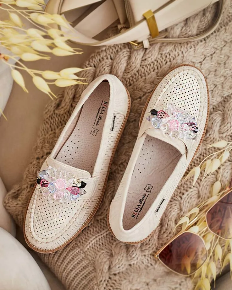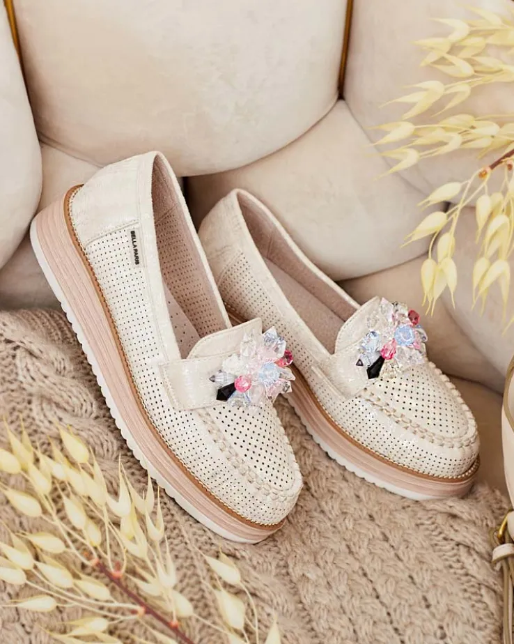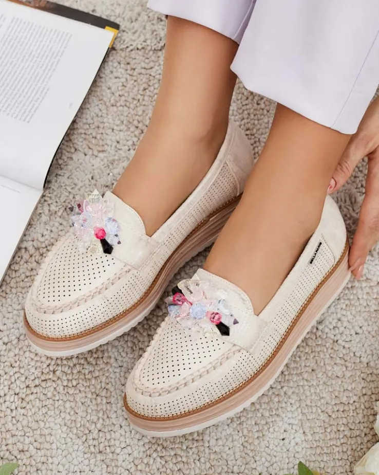 - Przepiękne damskie mokasyny na grubszej podeszwie. Model w tylu casual i jest wykonany ze skóry ekologicznej zamszowej z ażurowymi wstawkami, wkładka to skóra naturalna. Na nosku ozdoba z kolorowymi kamyczkami. Idealna baza dla wielu codziennych looków!