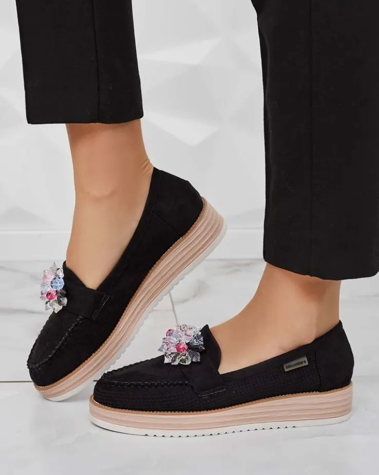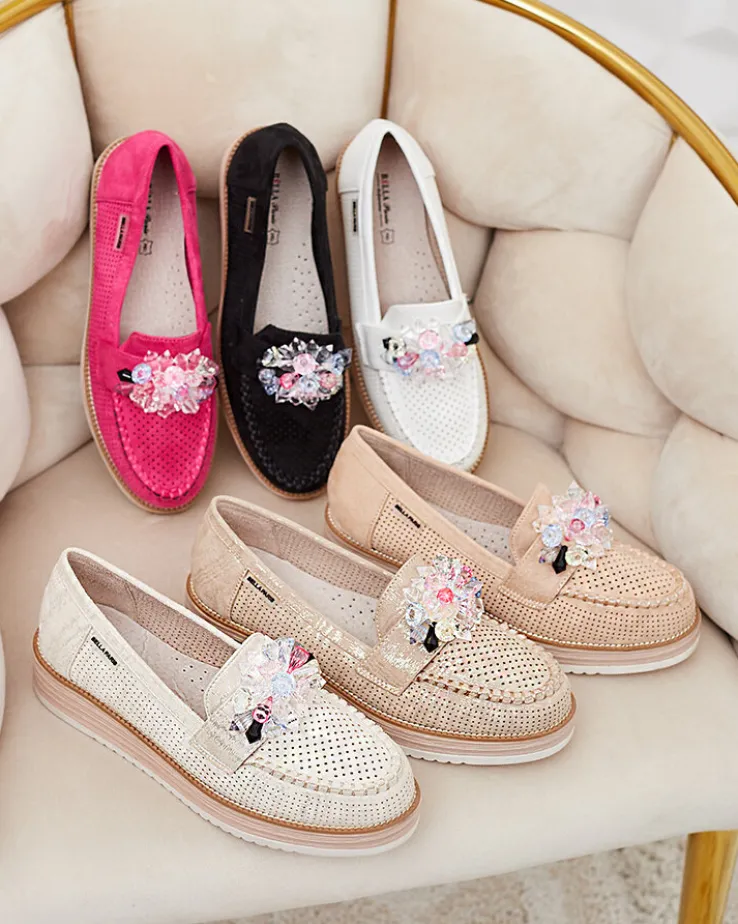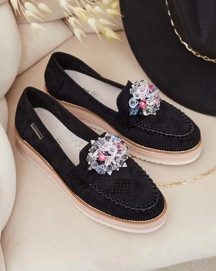 - Przepiękne damskie mokasyny na grubszej podeszwie. Model w tylu casual i jest wykonany ze skóry ekologicznej zamszowej z ażurowymi wstawkami, wkładka to skóra naturalna. Na nosku ozdoba z kolorowymi kamyczkami. Idealna baza dla wielu codziennych looków!