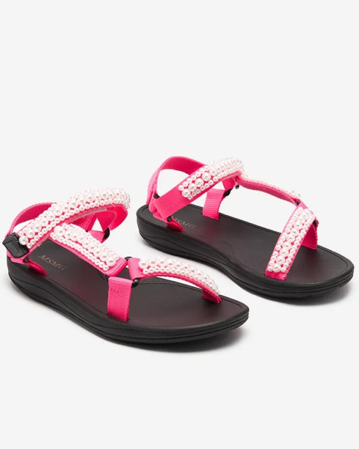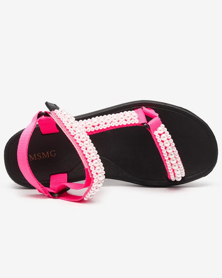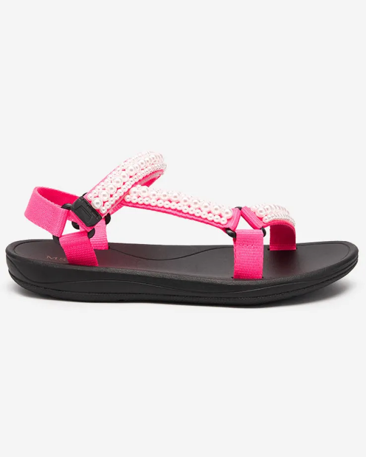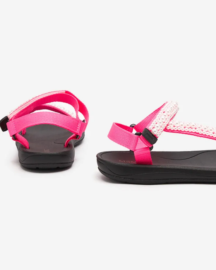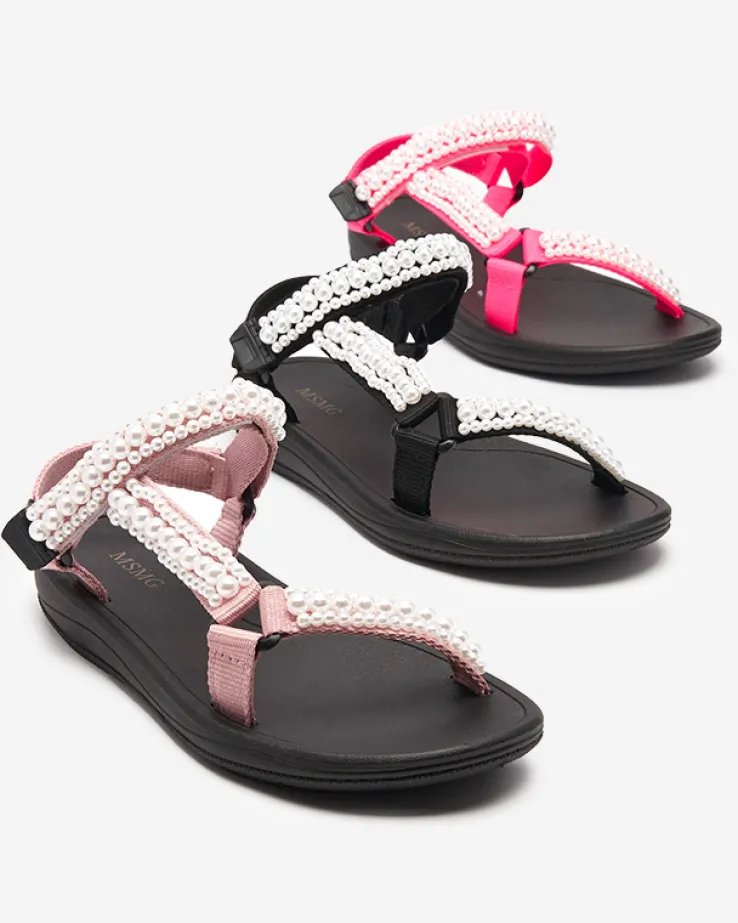 - Sportowe damskie sandały na gumowej podeszwie, posiadają paseczki z materiału tkaninowego, które zdobione są perełkami. Prezentowane obuwie damskie jest zapinane na rzepy. Dobrze przylegają do stopy!