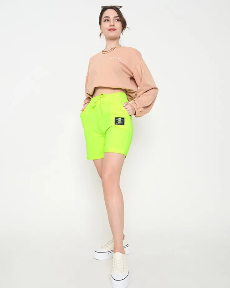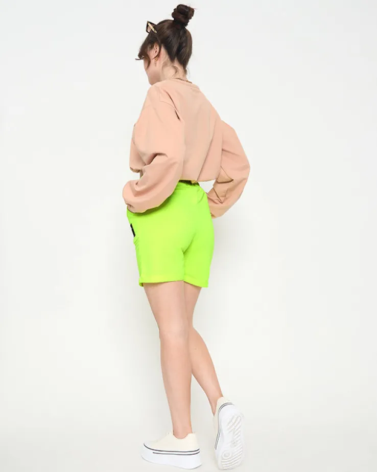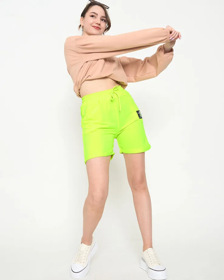 - Sportowe spodenki damskie przed kolano, zdobione naszywką. Model posiada 2 kieszenie, gumę i troczki w pasie. Bardzo wygodne spodenki, które będą świetnie współgrały ze sportowymi butami! UWAGA: Dokładność pomiaru (+/-) 1 cm.