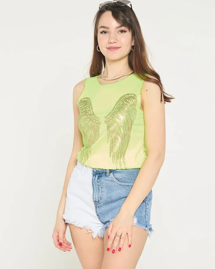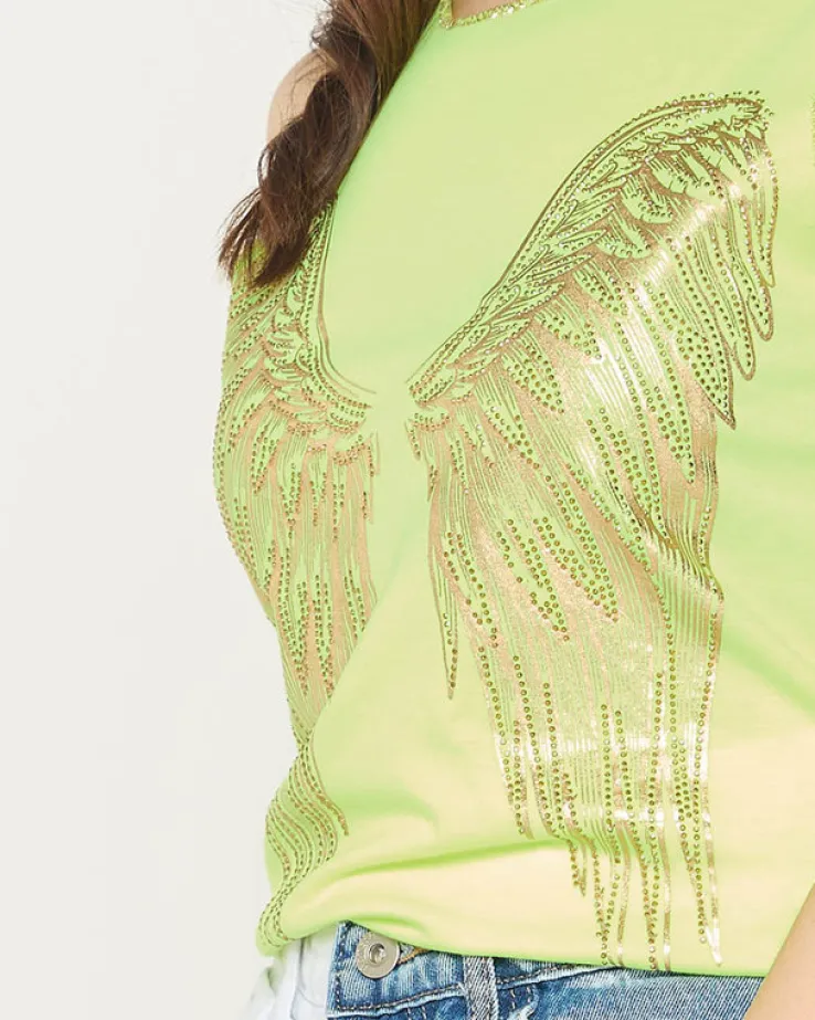 Royalfashion Neonowy żółty damski top ze złotym nadrukiem skrzydeł