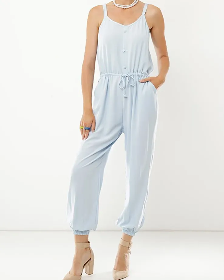 - Lekki damski kombinezon na cienkich regulowanych ramiączkach. Produkt wykonany ze 100% bawełny, przednia część dekorowana guzikami, nogawki zakończone gumką. Szerokość w talii można regulować za pomocą wiązania. UWAGA: Dokładność pomiaru (+/-) 1 cm.