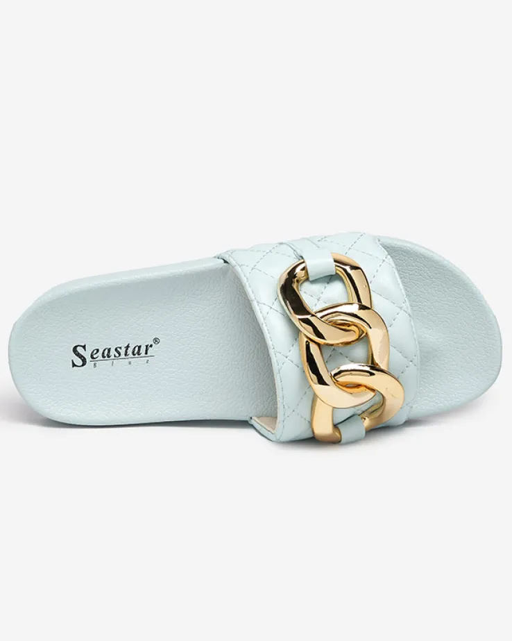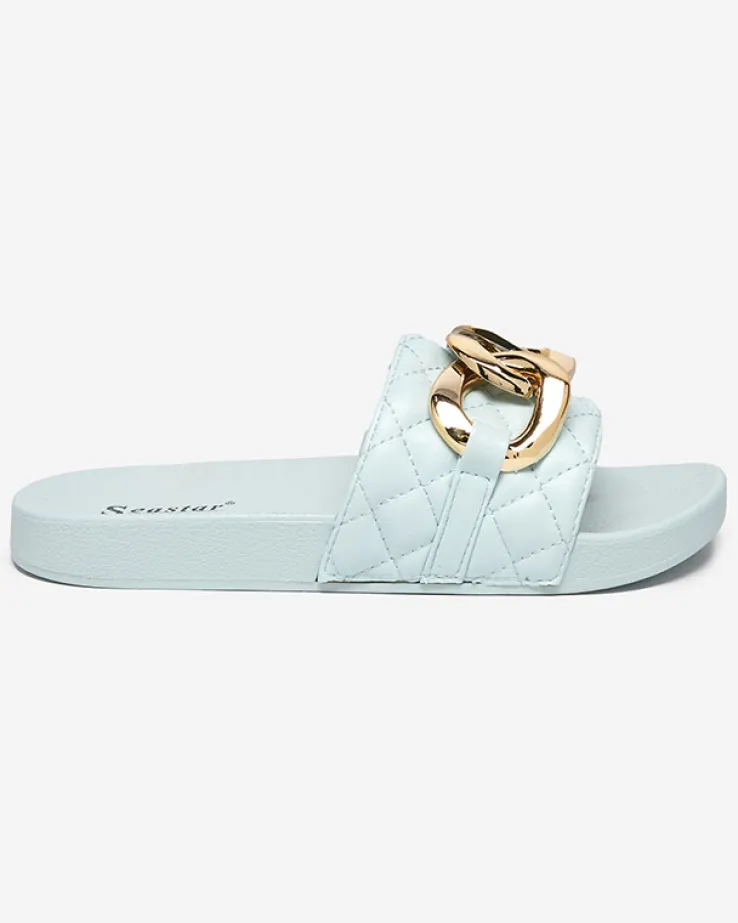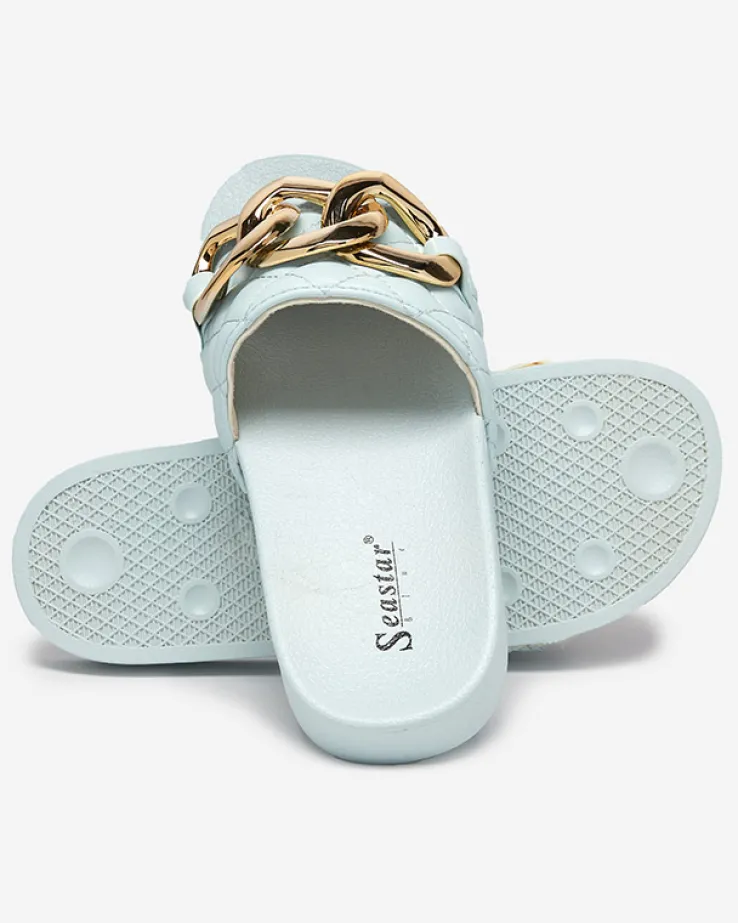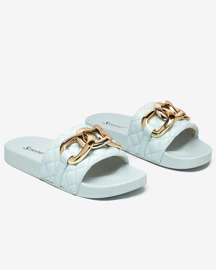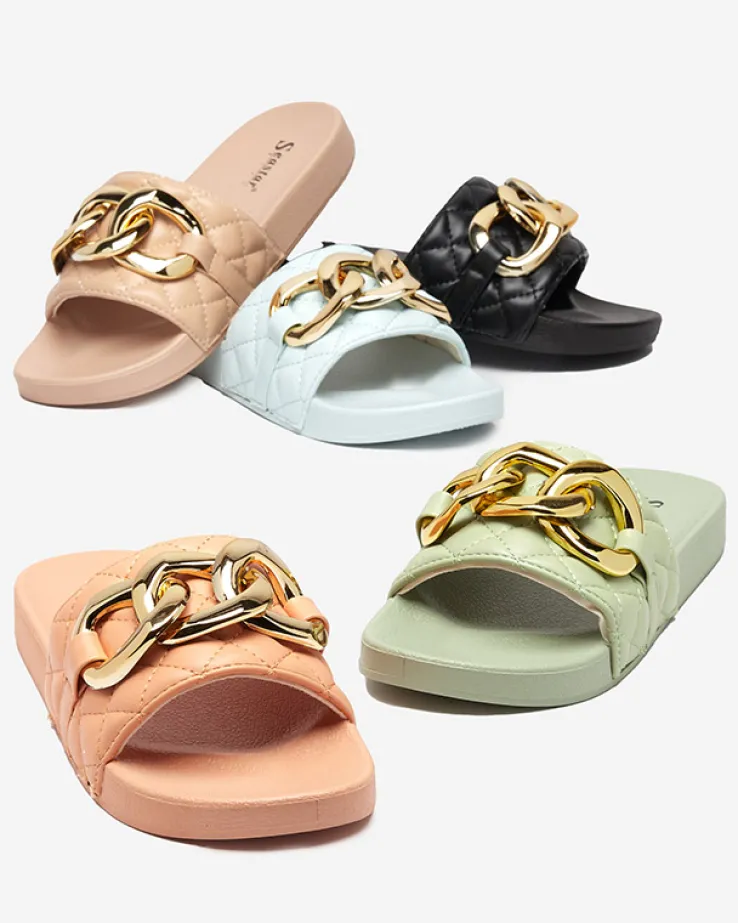 - Najmodniejsze w tym sezonie damskie klapki wykonane z pikowanej skóry ekologicznej. Model zdobiony dużym plastikowym łańcuszkiem w złotym kolorze. Wkładka jak i podeszwa to tworzywo gumowe. Super dodatek do Twoich letnich casualowych outfitów!