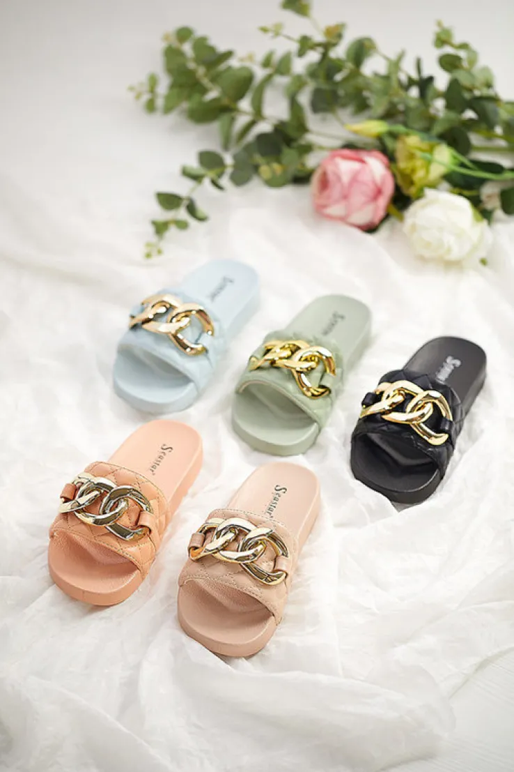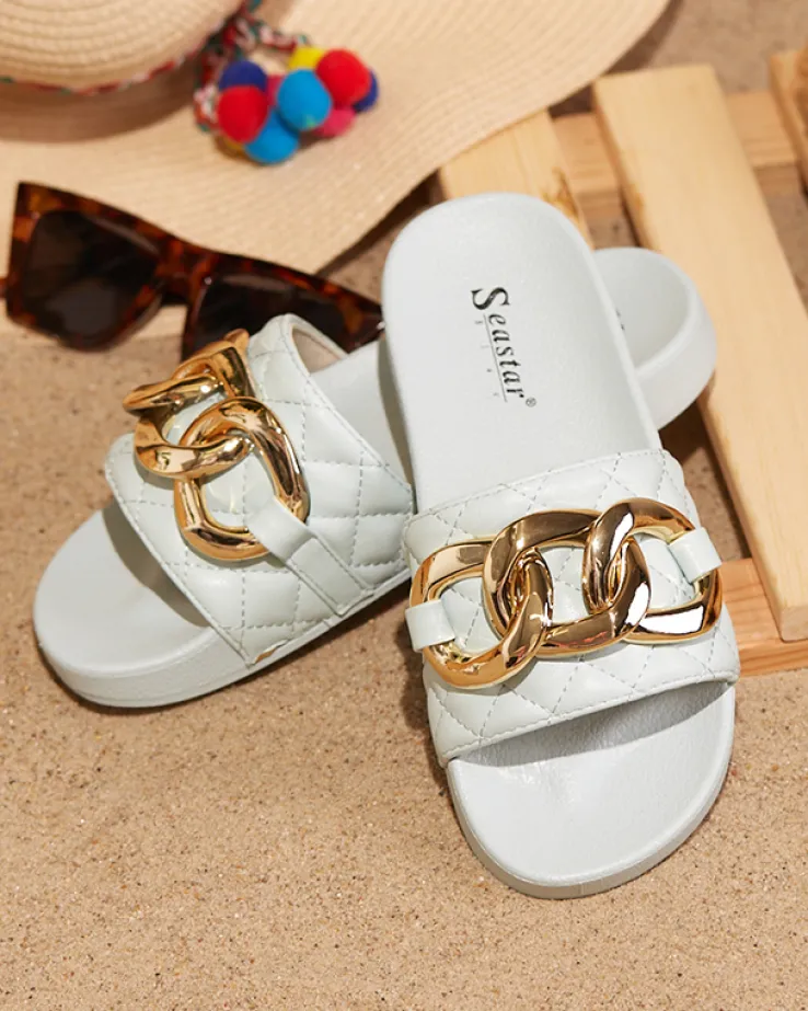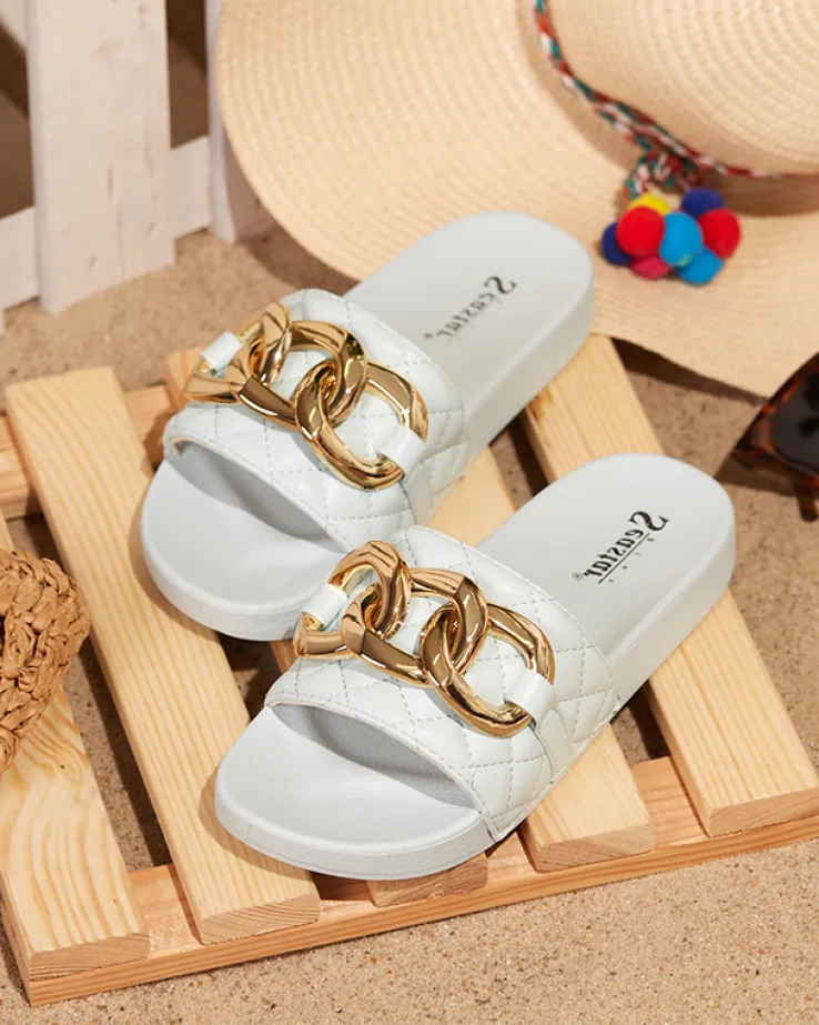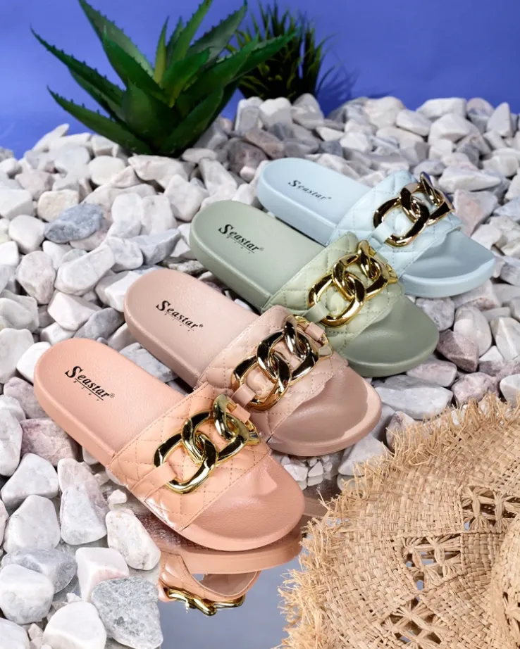 - Najmodniejsze w tym sezonie damskie klapki wykonane z pikowanej skóry ekologicznej. Model zdobiony dużym plastikowym łańcuszkiem w złotym kolorze. Wkładka jak i podeszwa to tworzywo gumowe. Super dodatek do Twoich letnich casualowych outfitów!