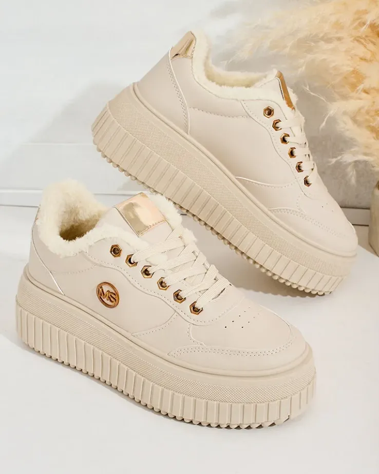 - Sportowe sneakersy damskie na grubszej podeszwie. Cholewka sznurowana, wykonana ze skóry ekologicznej. Wnętrze w całości ocieplone futerkiem. Idealne na chłodniejsze dni!