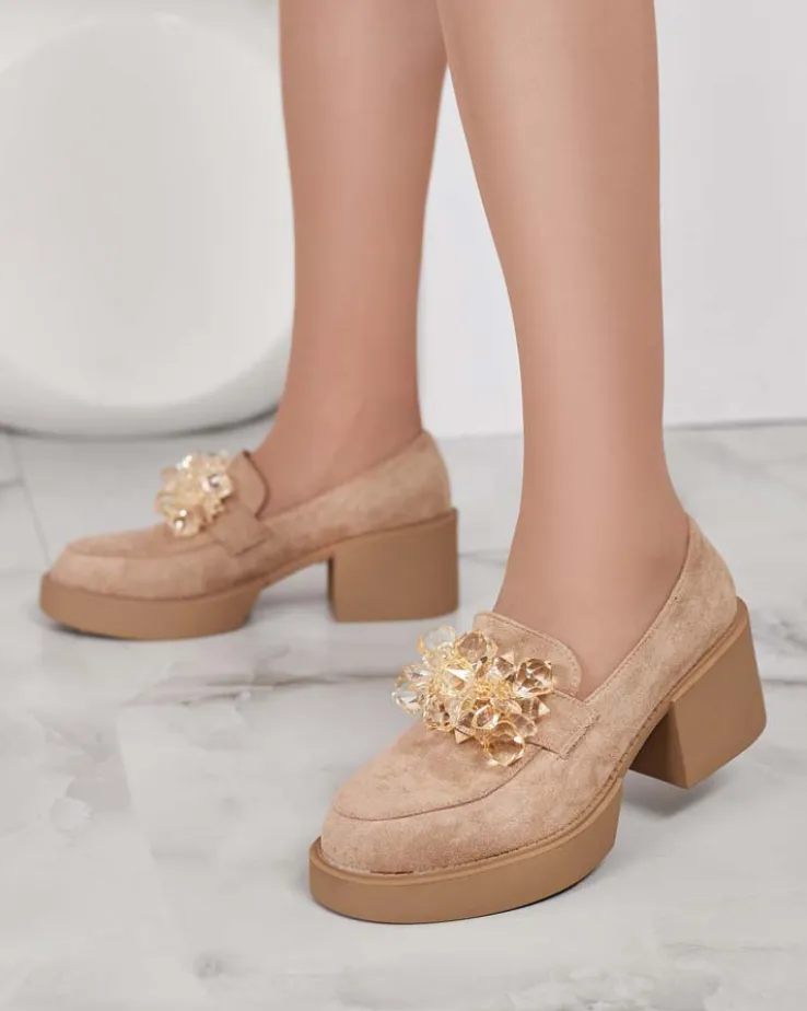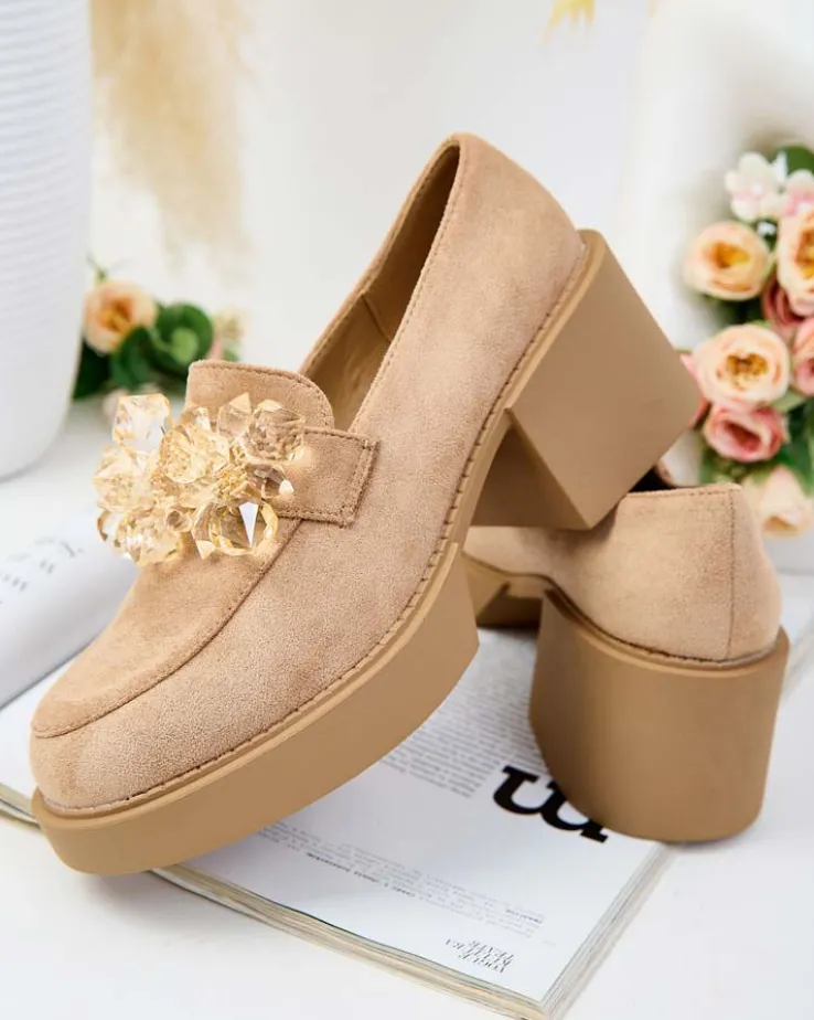 - Przepiękne damskie półbuty typu mokasyny na słupku. Model w tylu casual i jest wykonany ze skóry ekologicznej zamszowej i wkładki z eko skóry. Nosek zaokrąglony, zdobiony kryształkami. Idealna baza dla wielu codziennych looków!