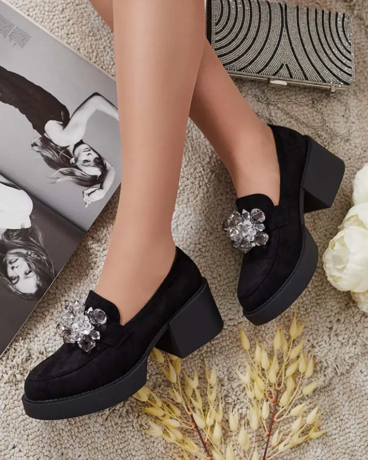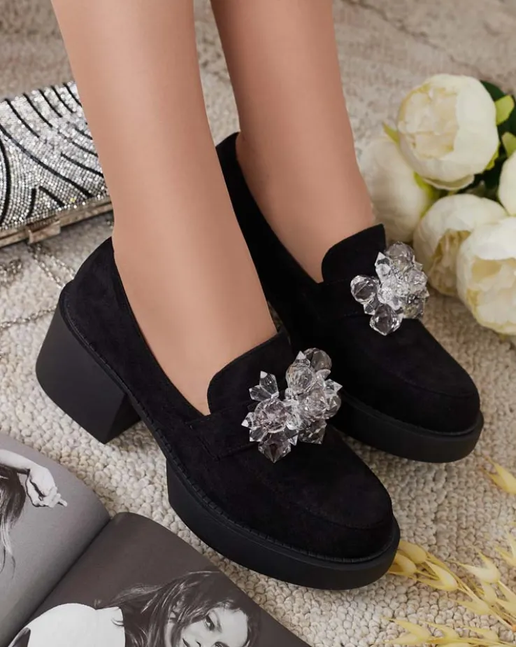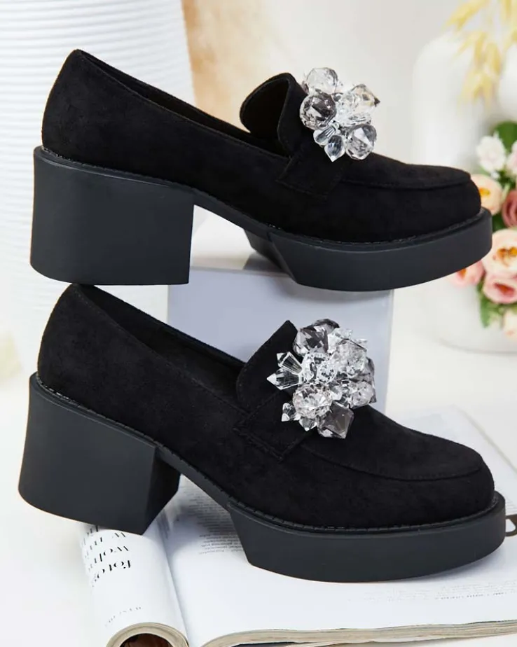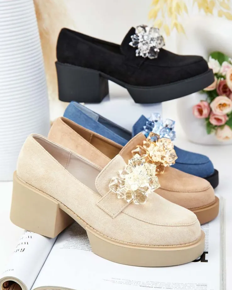 - Przepiękne damskie półbuty typu mokasyny na słupku. Model w tylu casual i jest wykonany ze skóry ekologicznej zamszowej i wkładki z eko skóry. Nosek zaokrąglony, zdobiony kryształkami. Idealna baza dla wielu codziennych looków!