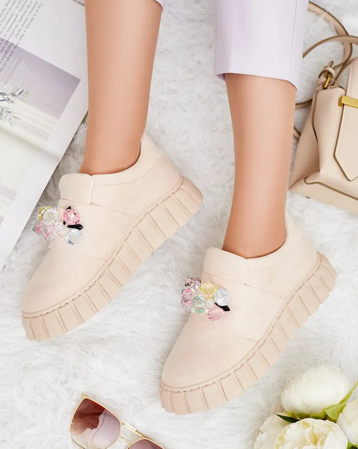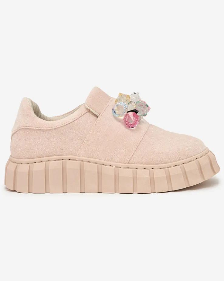 - Przepiękne damskie sportowe półbuty na grubszej podeszwie. Model w tylu casual i jest wykonany ze skóry ekologicznej zamszowej, wkładka to tkanina. Na nosku ozdoba z kolorowymi kamyczkami. Idealna baza dla wielu codziennych looków!