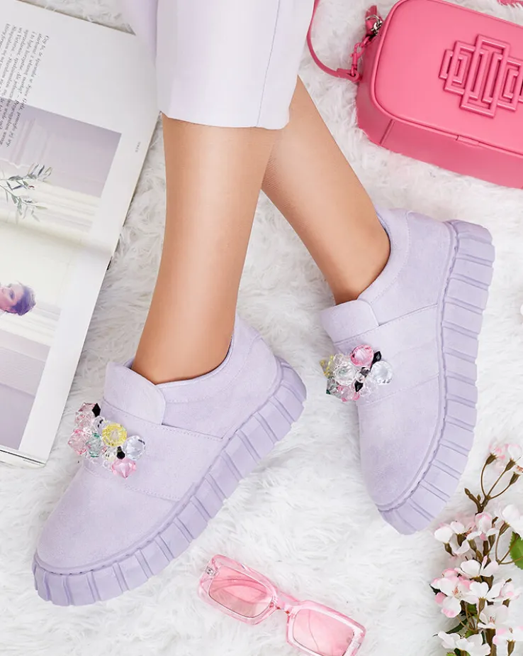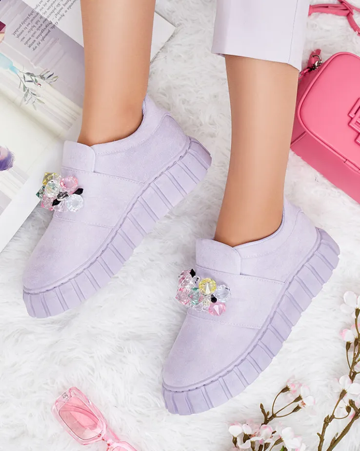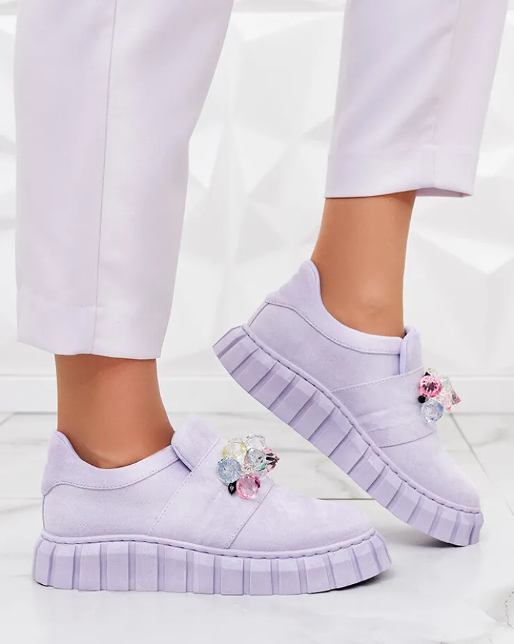 - Przepiękne damskie sportowe półbuty na grubszej podeszwie. Model w tylu casual i jest wykonany ze skóry ekologicznej zamszowej, wkładka to tkanina. Na nosku ozdoba z kolorowymi kamyczkami. Idealna baza dla wielu codziennych looków!