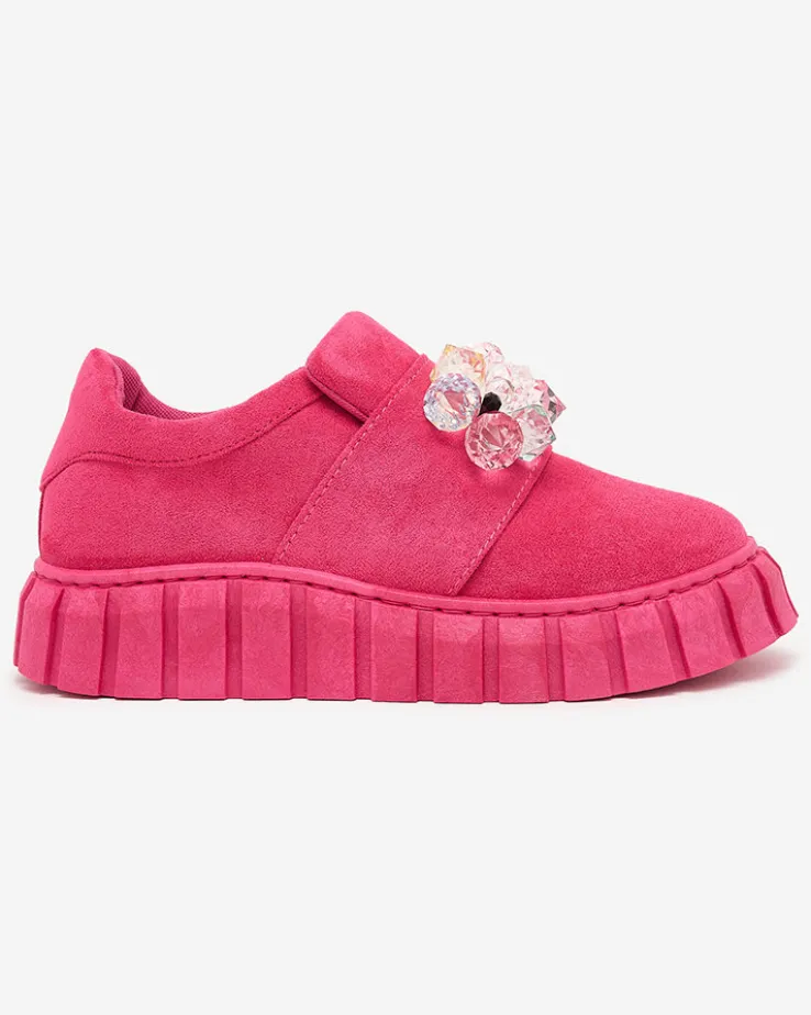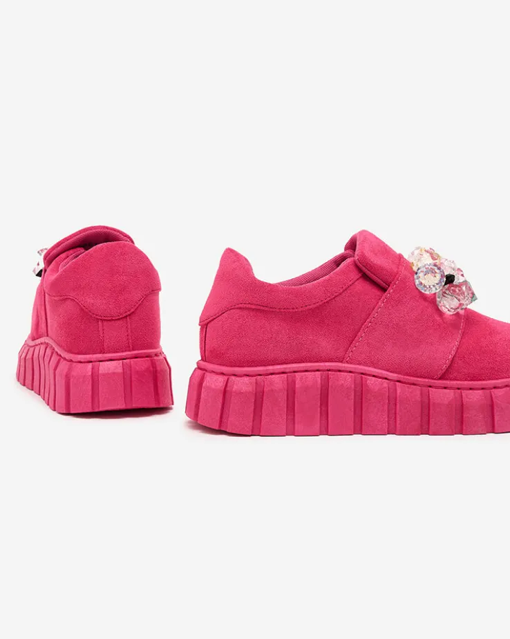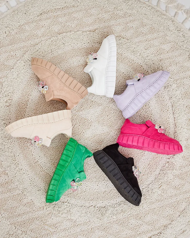 - Przepiękne damskie sportowe półbuty na grubszej podeszwie. Model w tylu casual i jest wykonany ze skóry ekologicznej zamszowej, wkładka to tkanina. Na nosku ozdoba z kolorowymi kamyczkami. Idealna baza dla wielu codziennych looków!