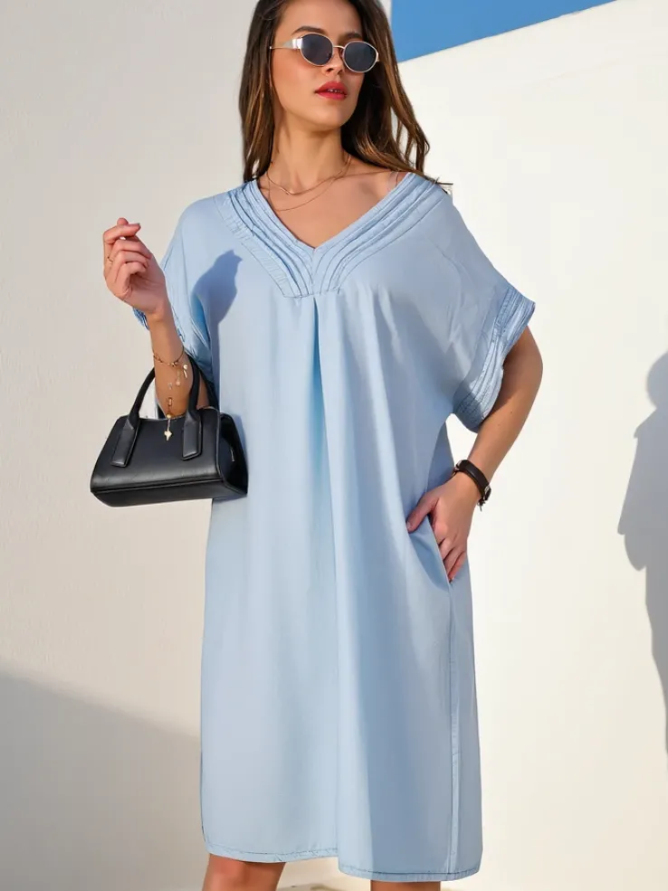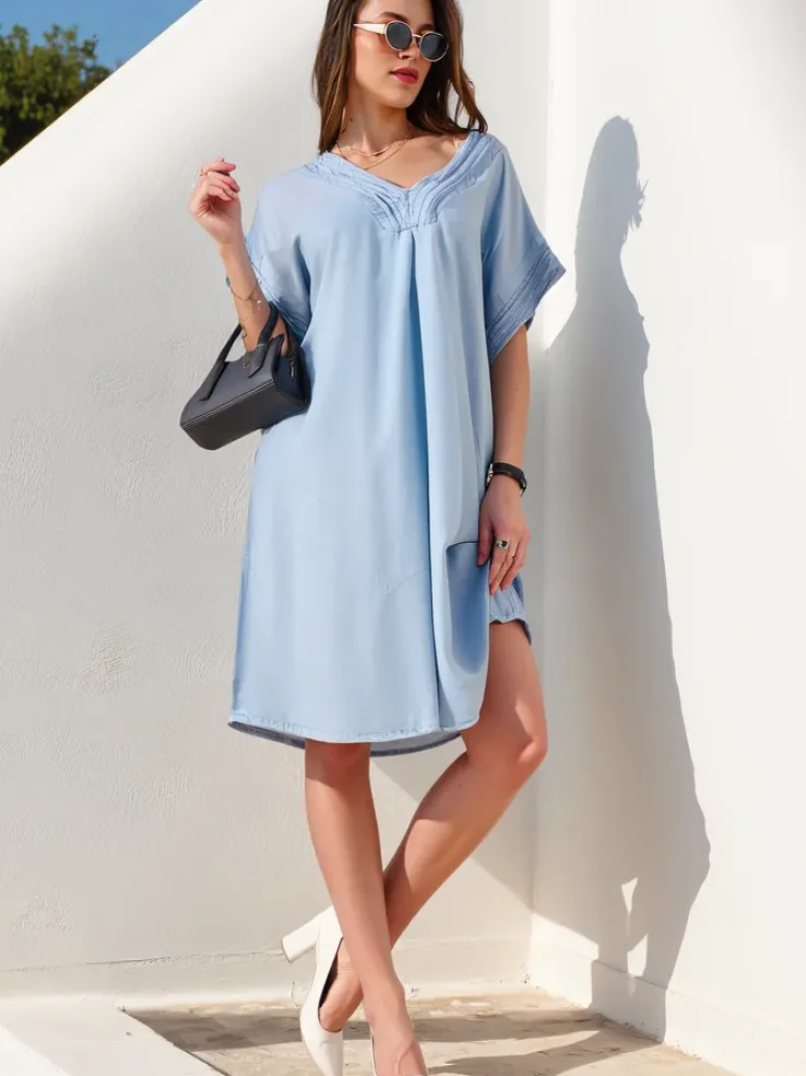 - Prosta damska tunika a’la sukienka typu jeansowa z dekoltem w serek i krótkimi rękawami. Wykonana z przyjemnego materiału. Poczuj z nią wiosenny klimat!