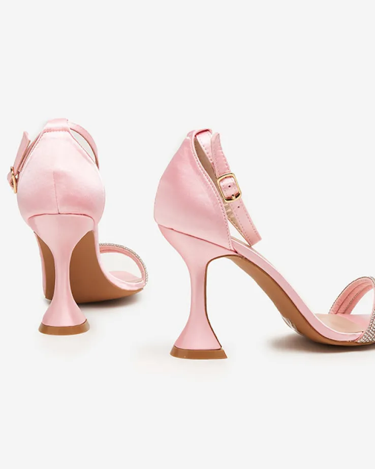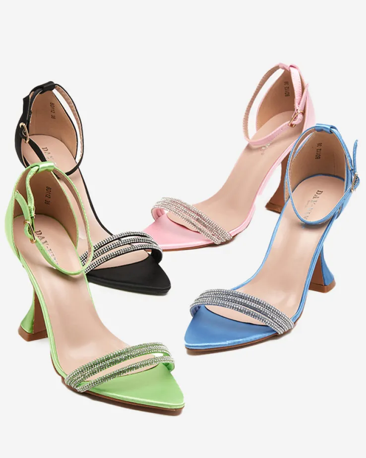 - Niespotykane damskie sandałki na szeroko zakończonej szpilce, wykonane z materiału tkaninowego z eko-skórzaną wkładką. Model z paseczkiem zapinanym na sprzączkę. UWAGA: produkt może posiadać śladowe ilości kleju na materiale.