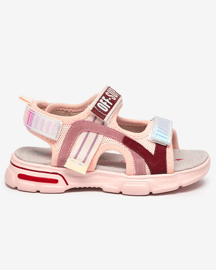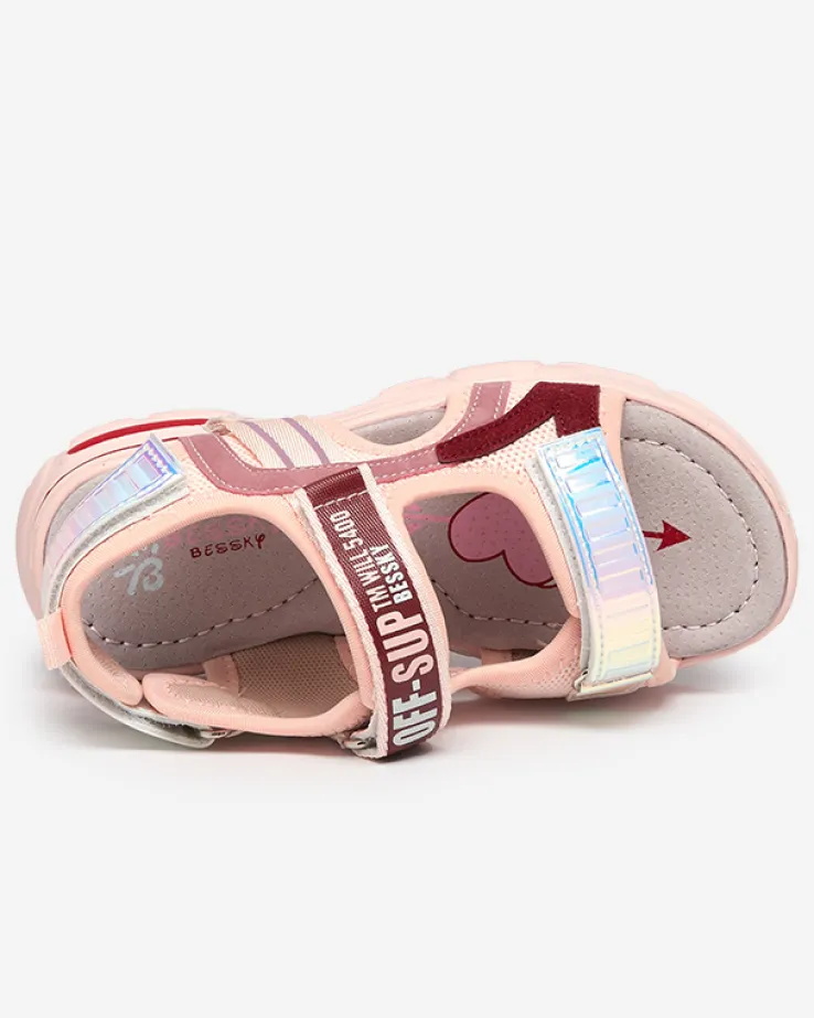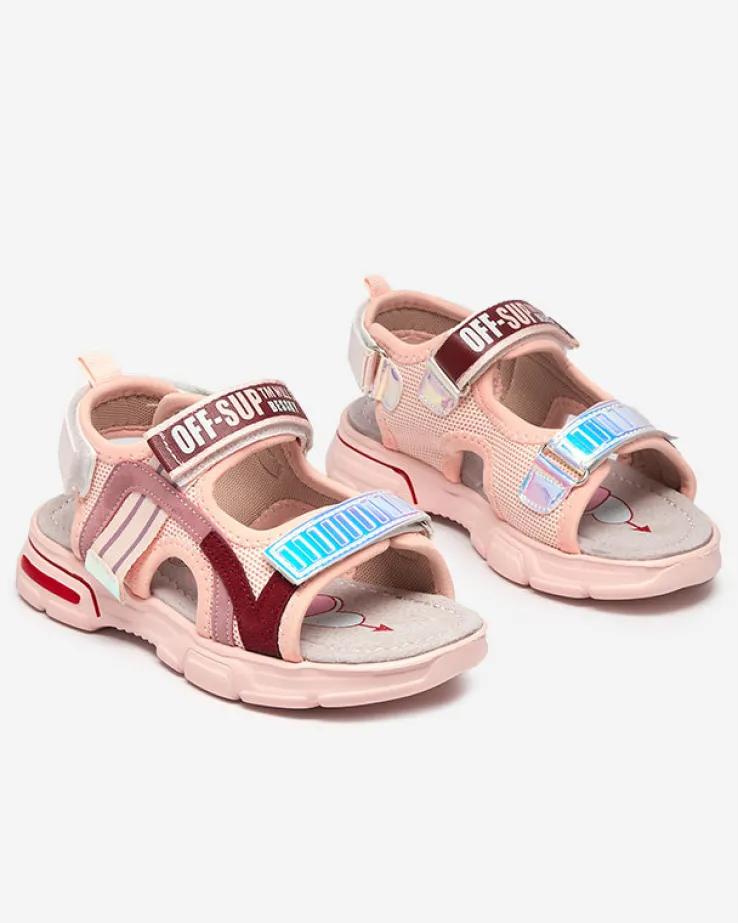 - Wyjątkowe dziewczęce sandały wykonane z tkaniny. Wkładka zaś to skóra ekologiczna. Model zapinany na rzep. Buty zdobione holograficznymi wstawkami. Sandałki to najlepsze obuwie na lato!