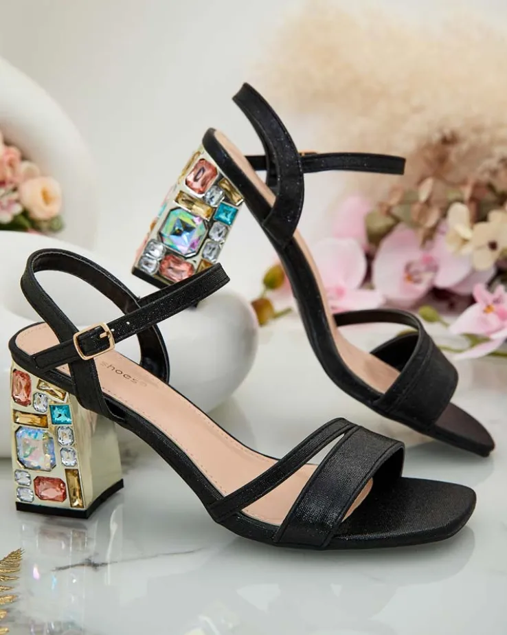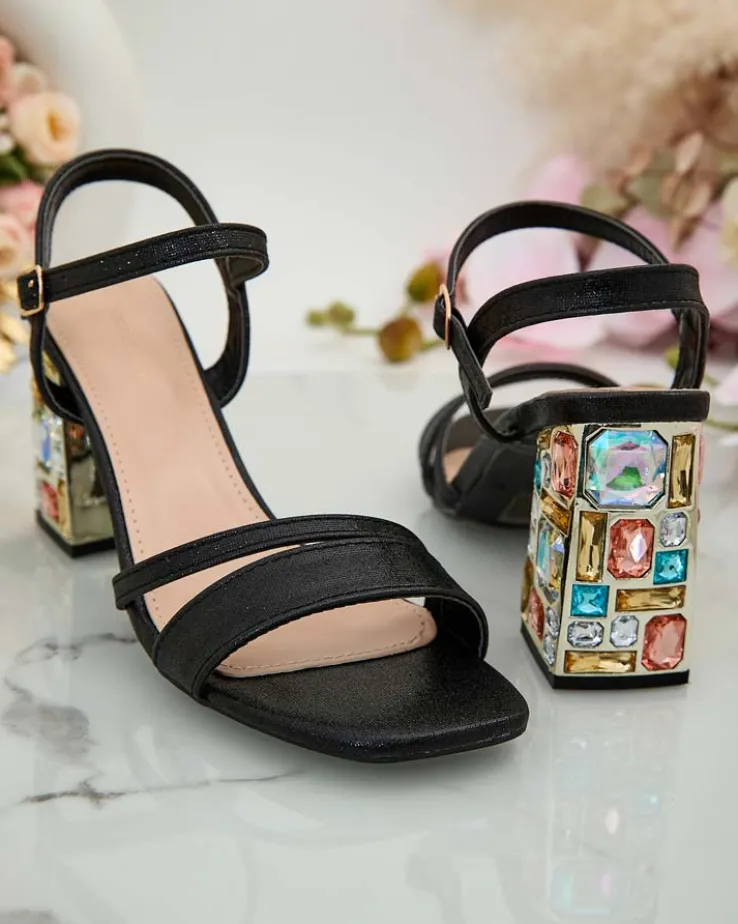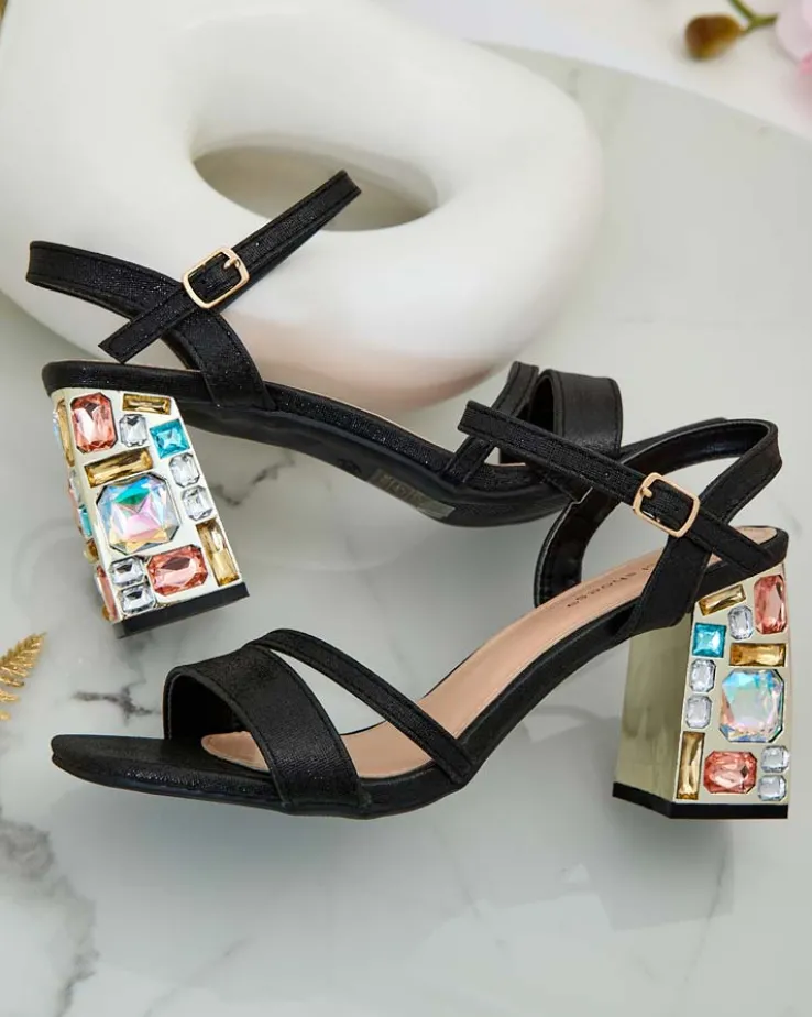 - Sandałki pokryte tkaniną z brokatem na wysokim słupku z kryształkami, zapinane na sprzączkę. Eko skórzana wkładka. Mieszanka stylu i wygody. Solidny obcas nadaje pewności kroku. Doskonałe na każdą okazję!