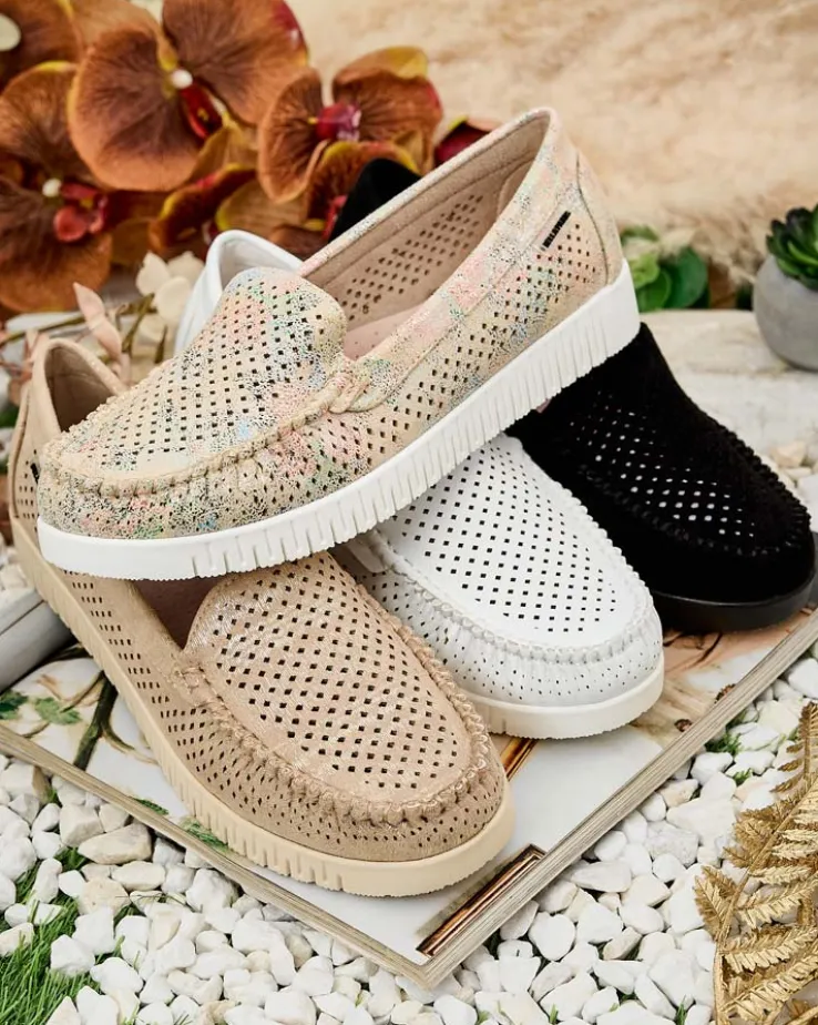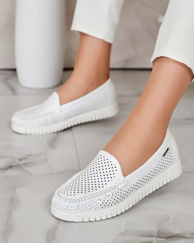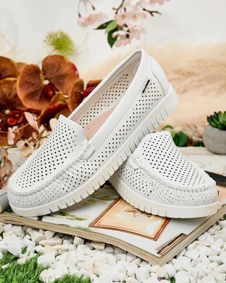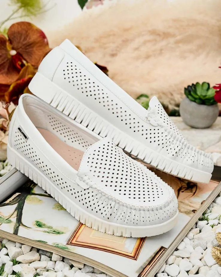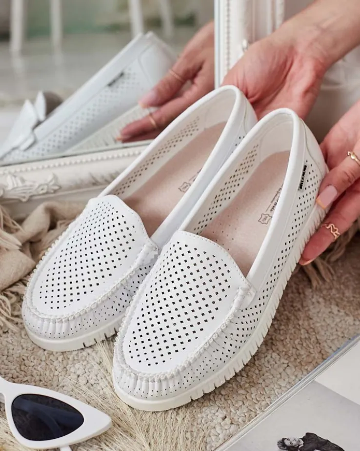 - Skórzane damskie mokasyny na płaskiej podeszwie. Model jest wykonany ze skóry ekologicznej. W środku wkładka ze skóry naturalnej. Idealna baza na co dzień!