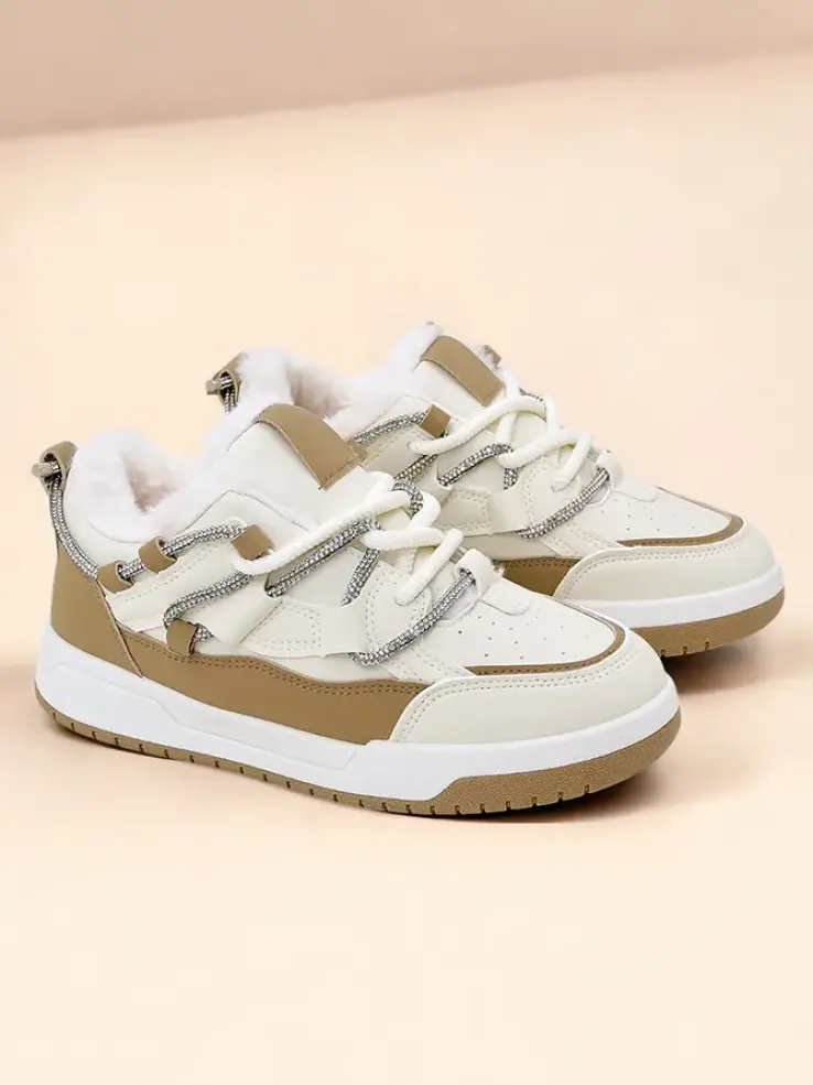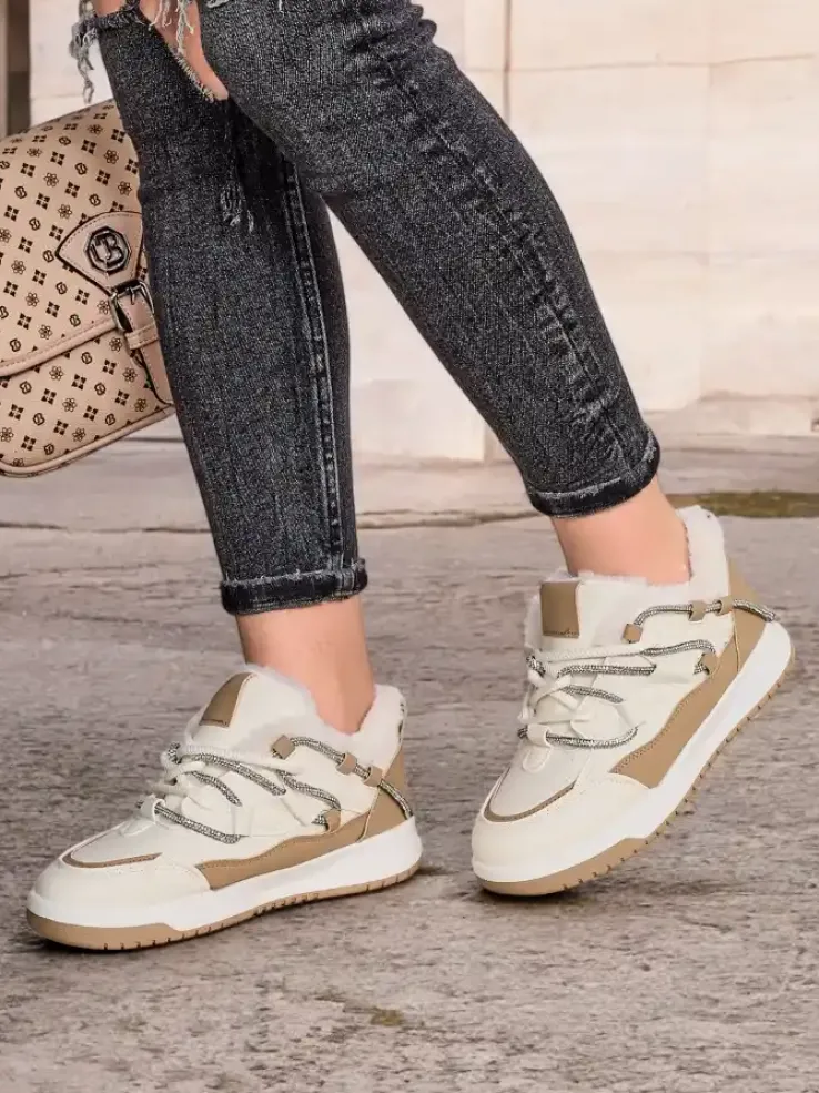 - Damskie ocieplane buty sportowe typu sneakersy na płaskiej podeszwie. Model wykonana z eko skóry. Sznurowana cholewka posiada cekinową ozdobę. W środku miękkie futerko. Super dodatek do twoich zimowych outfitów w stylu casual!