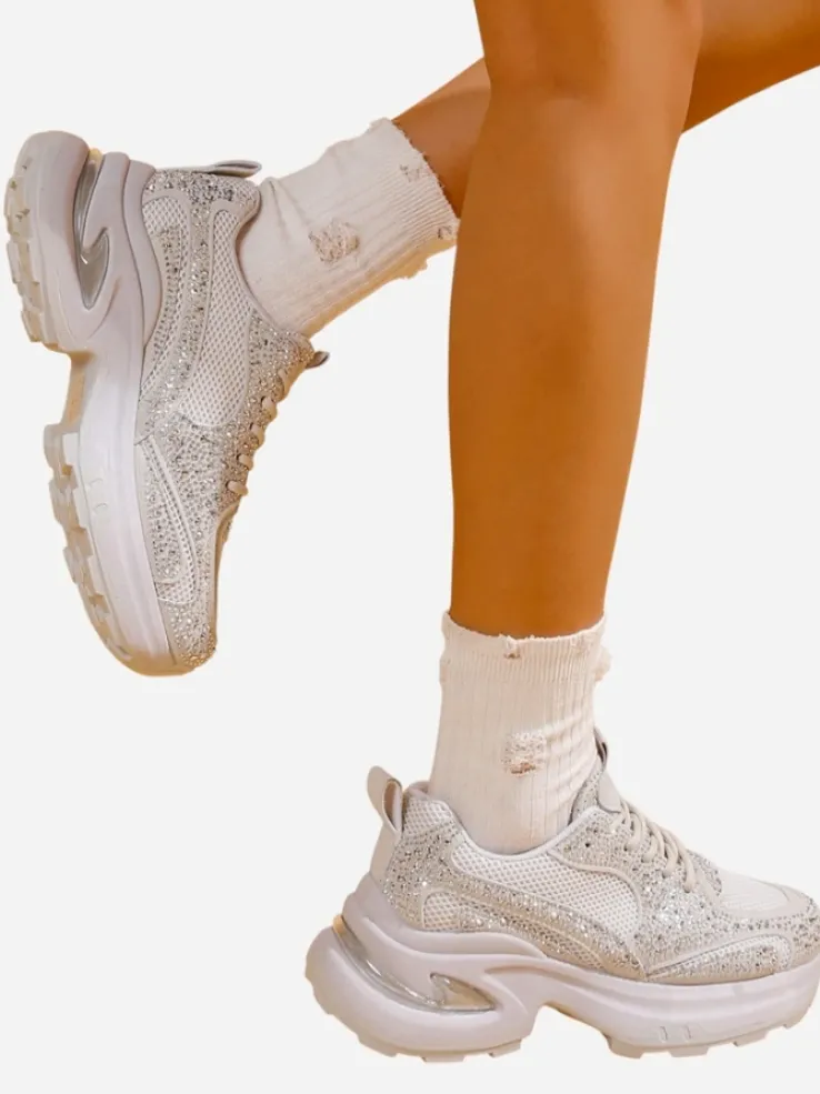- Sneakersy damskie na platformie- perfekcyjne połączenie stylu i komfortu. Obuwie wykonane z tkaniny zdobionej cyrkoniami. Model sznurowany, posiada tkaninową wkładkę. Idealne dla aktywnych osób!