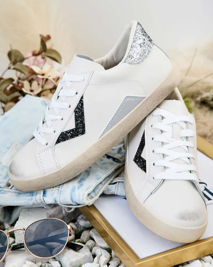 - Eko skórzane sneakersy damskie na płaskiej podeszwie – perfekcyjne połączenie stylu i komfortu. Model sznurowany, posiada eko skórzaną wkładkę. Cholewka zdobiona ozdobnymi wstawkami z brokatu. Idealne do codziennych outfitów!