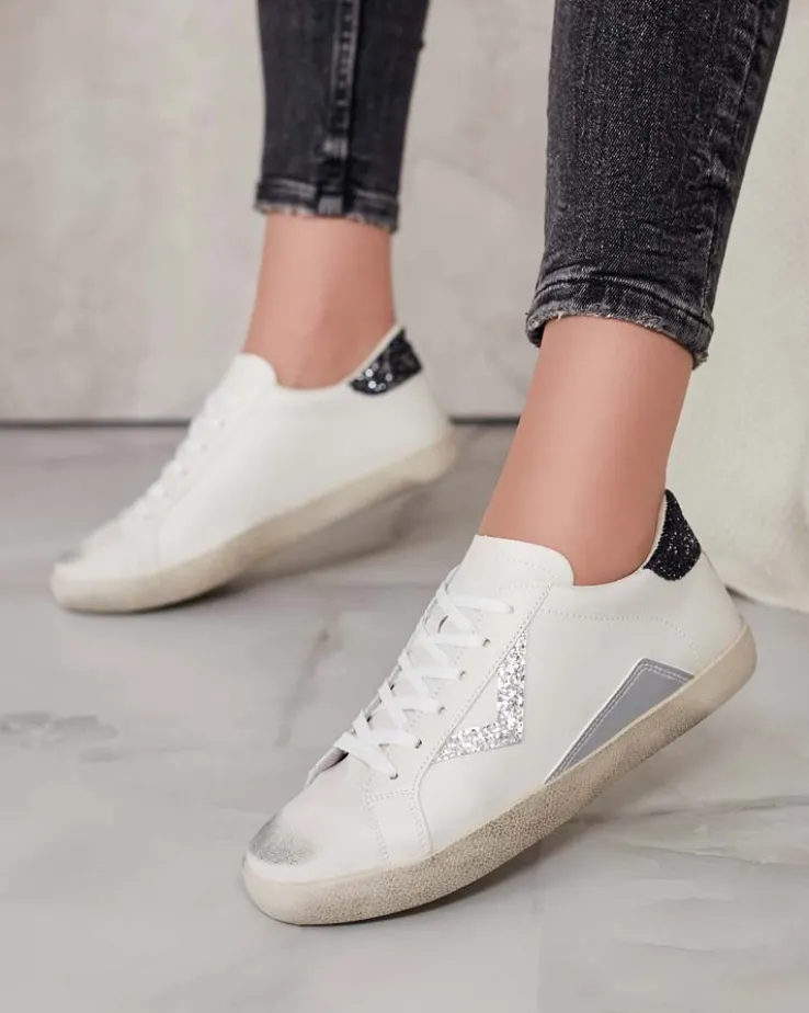 - Eko skórzane sneakersy damskie na płaskiej podeszwie – perfekcyjne połączenie stylu i komfortu. Model sznurowany, posiada eko skórzaną wkładkę. Cholewka zdobiona ozdobnymi wstawkami z brokatu. Idealne do codziennych outfitów!