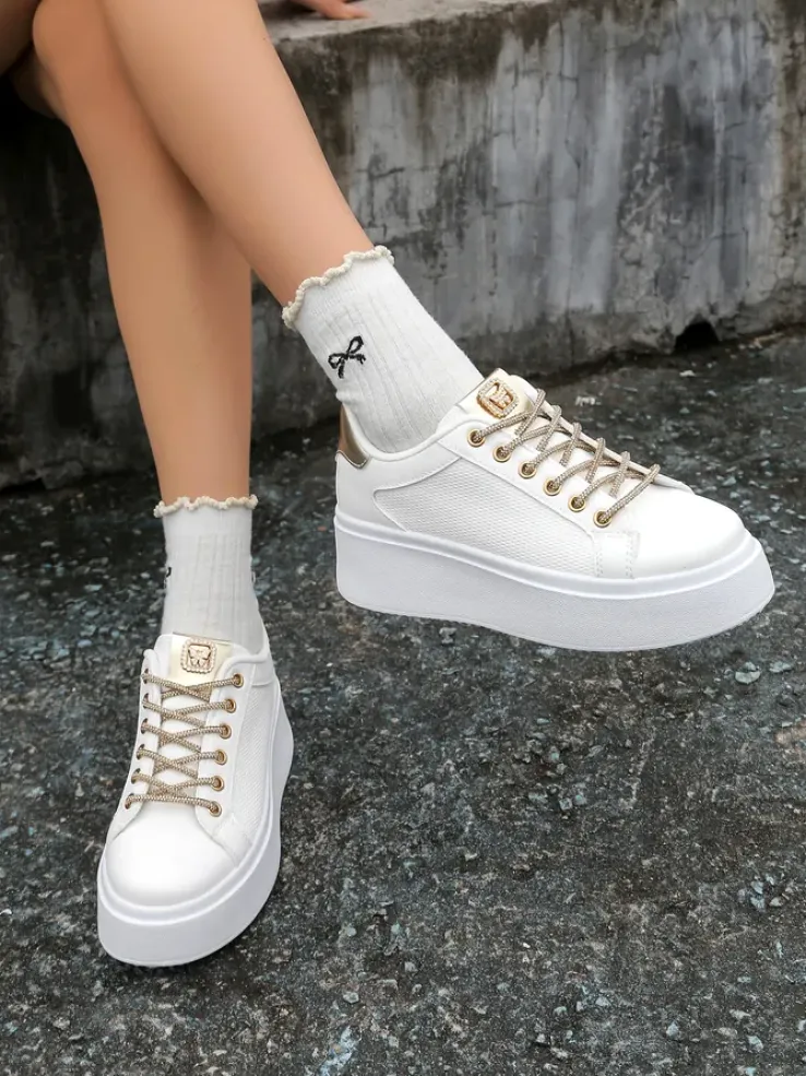 - Sneakersy damskie na platformie – perfekcyjne połączenie stylu i komfortu. Obuwie wykonane z eko skóry. Model sznurowany, posiada tkaninową wkładkę. Idealne dla aktywnych osób!