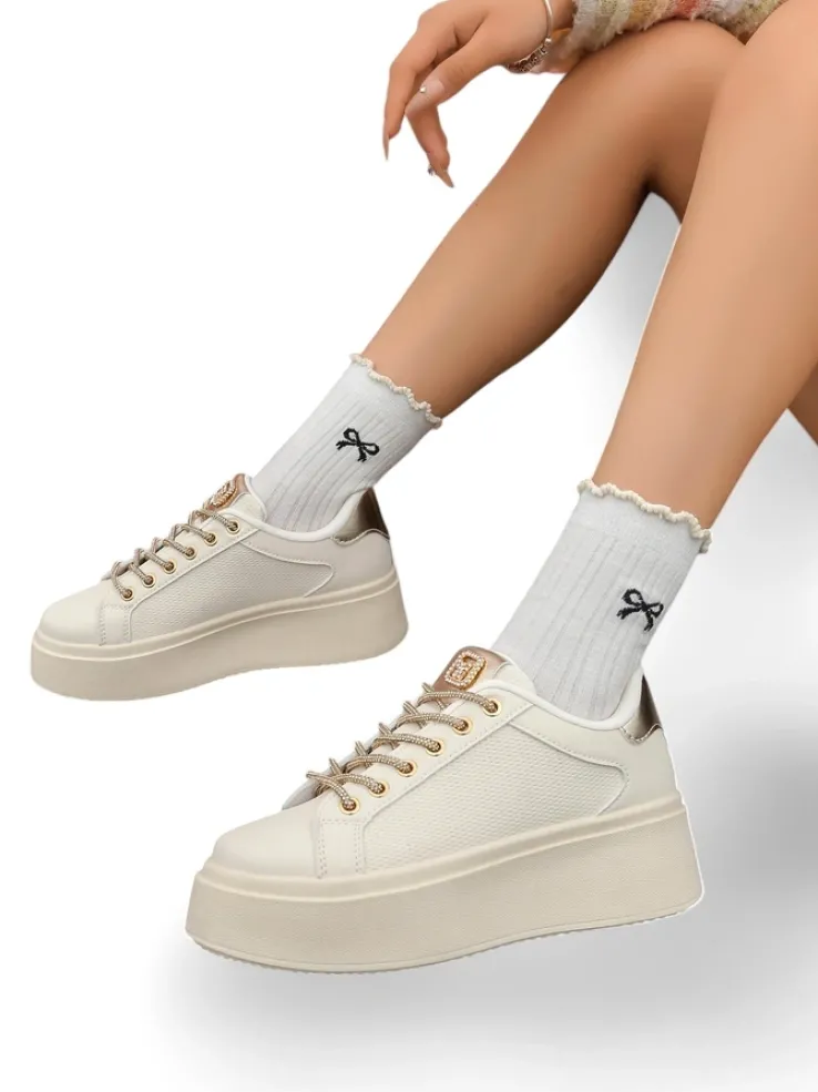 - Sneakersy damskie na platformie – perfekcyjne połączenie stylu i komfortu. Obuwie wykonane z eko skóry. Model sznurowany, posiada tkaninową wkładkę. Idealne dla aktywnych osób!