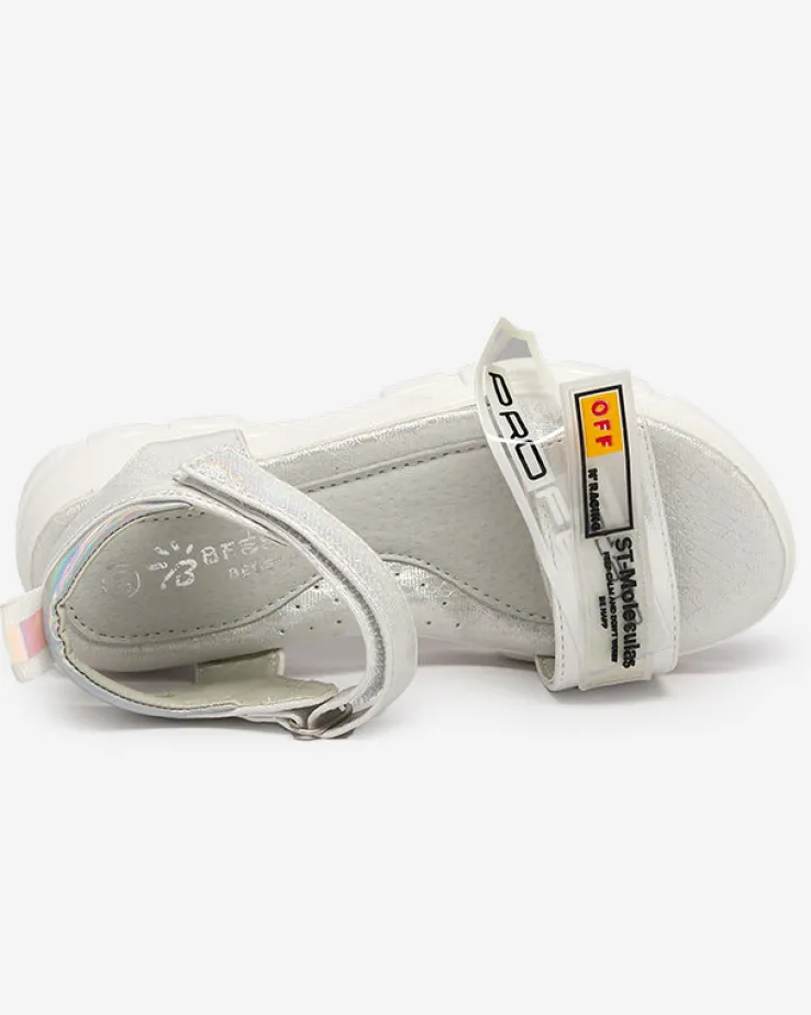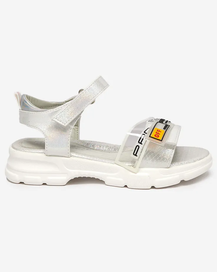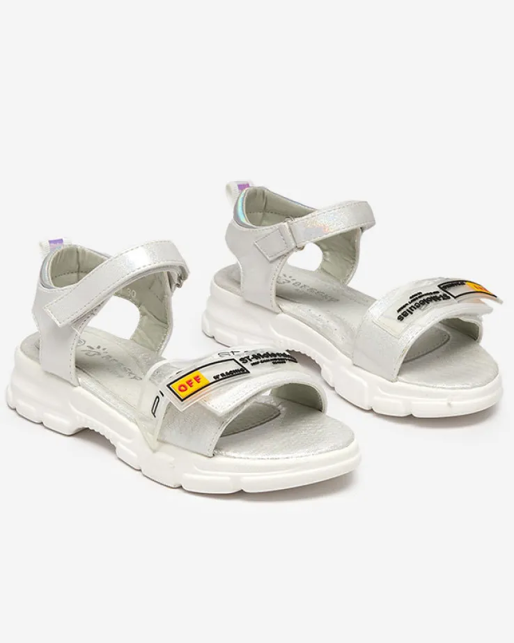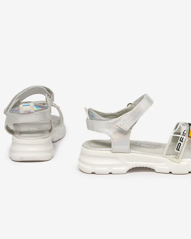 - Dziewczęce sandały wykonane ze skóry ekologicznej. Model zapinany na rzep, buty zdobione brokatem. Sandałki to najlepsze obuwie na lato!